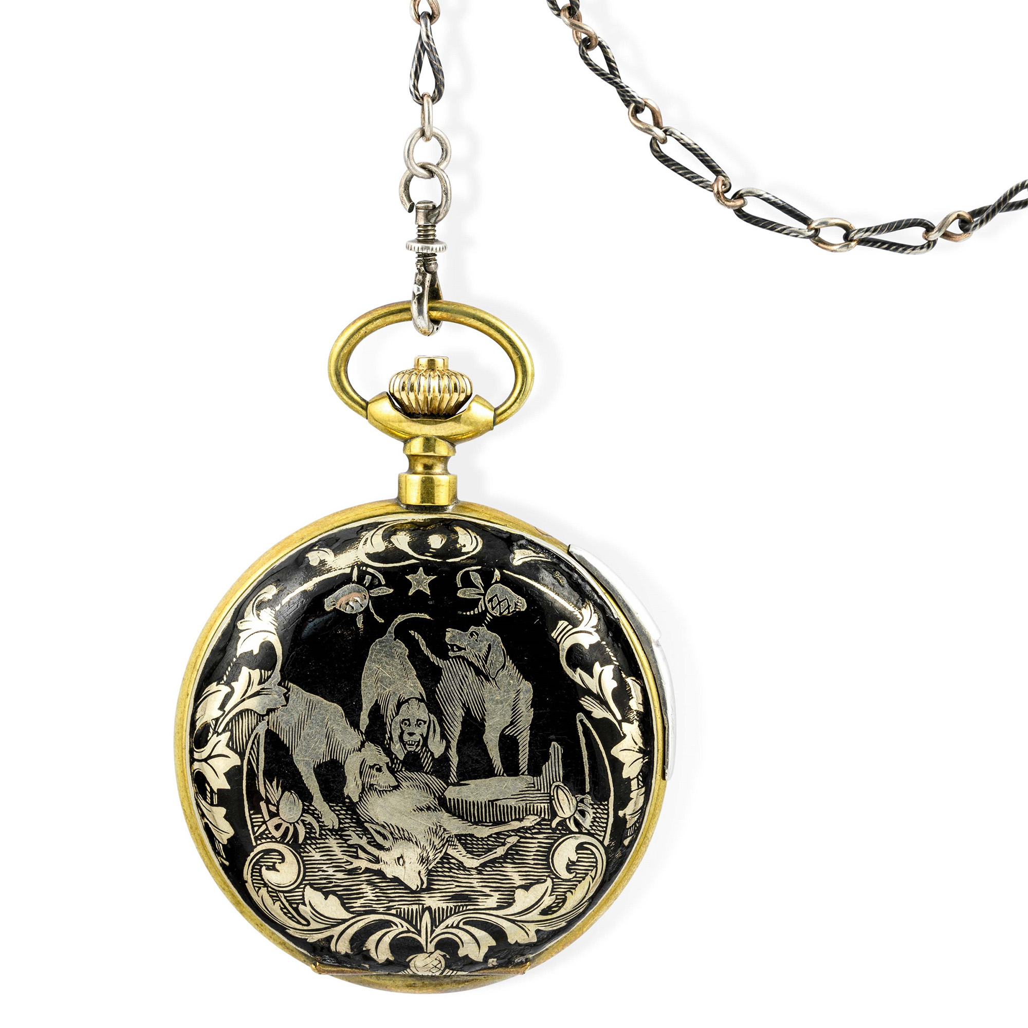 Orologio automa anonimo da tasca in argento niellato con scene di caccia ripetizione ore e minuti a slitta