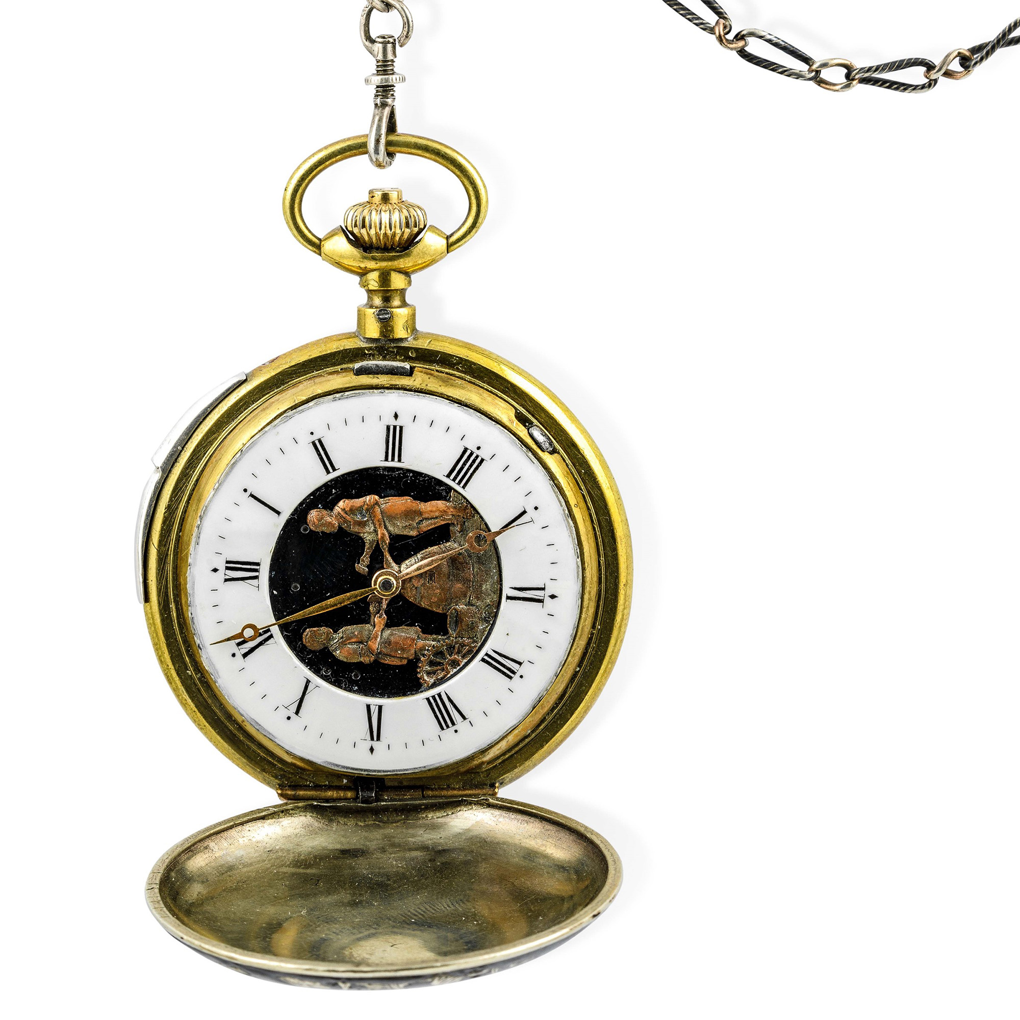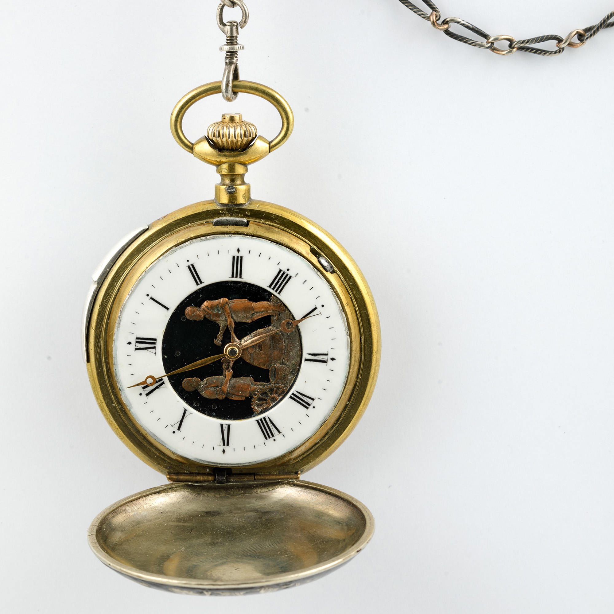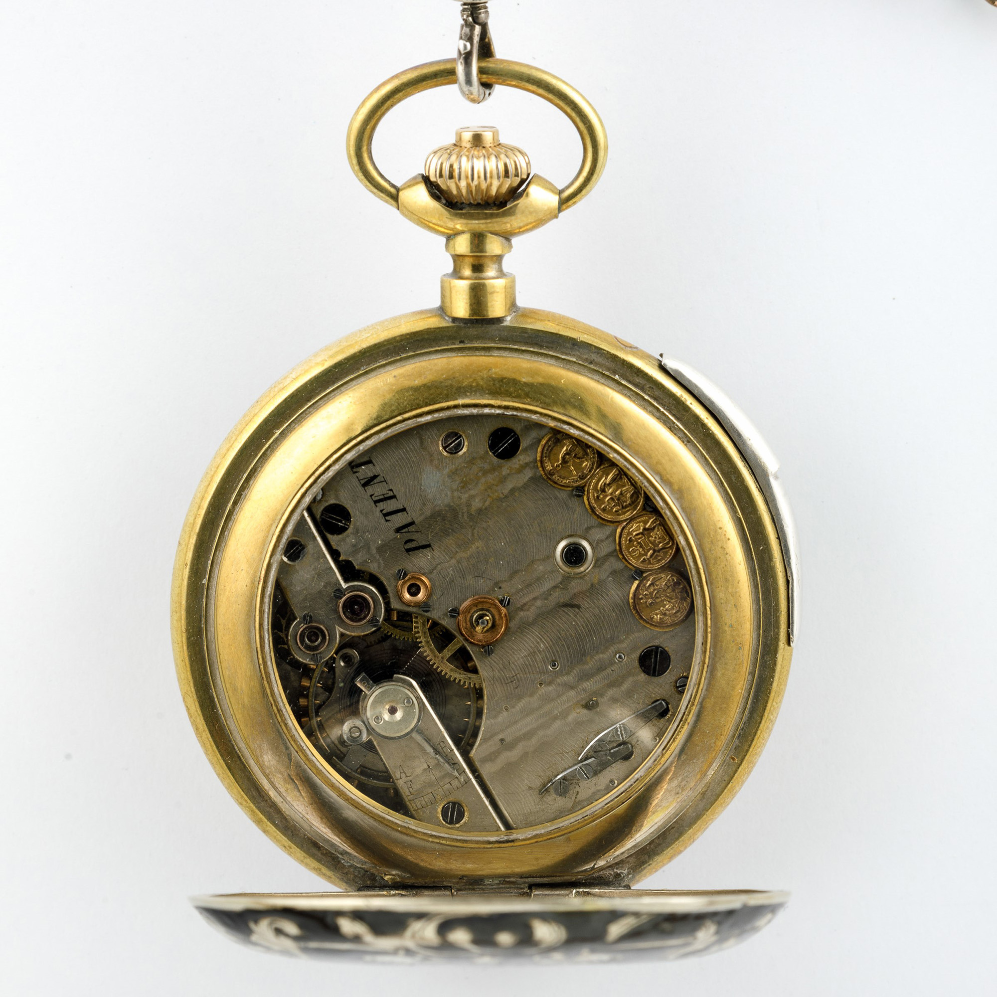 Orologio automa anonimo da tasca in argento niellato con scene di caccia ripetizione ore e minuti a slitta. Quadrante/Dial: In smalto bianco con automi/White enamel with automata