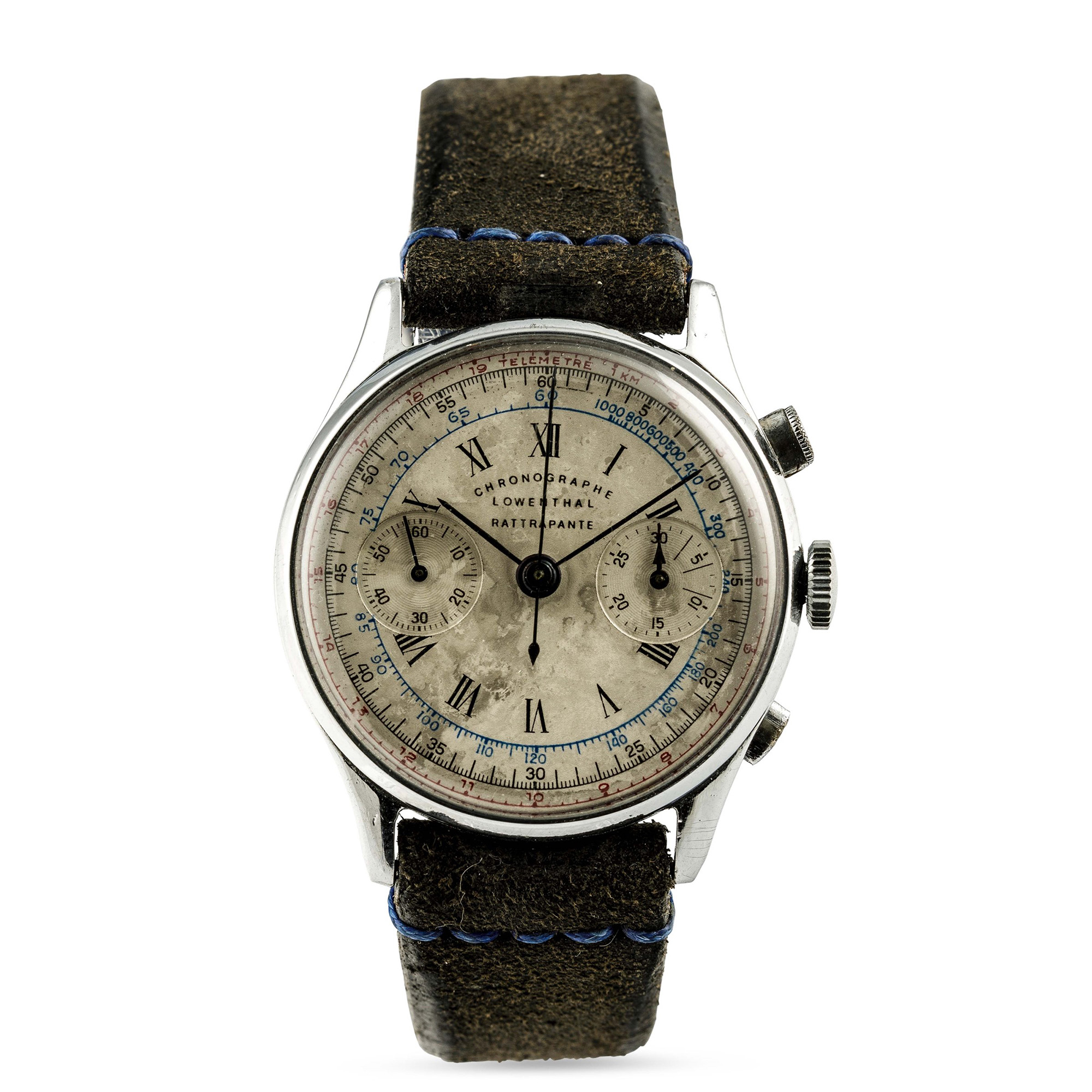 LOWENTHAL - Cronografo monorattrappante in acciaio, fondello a pressione, anni '40. Orologio professionale con scala tachimetrica e telemetrica.