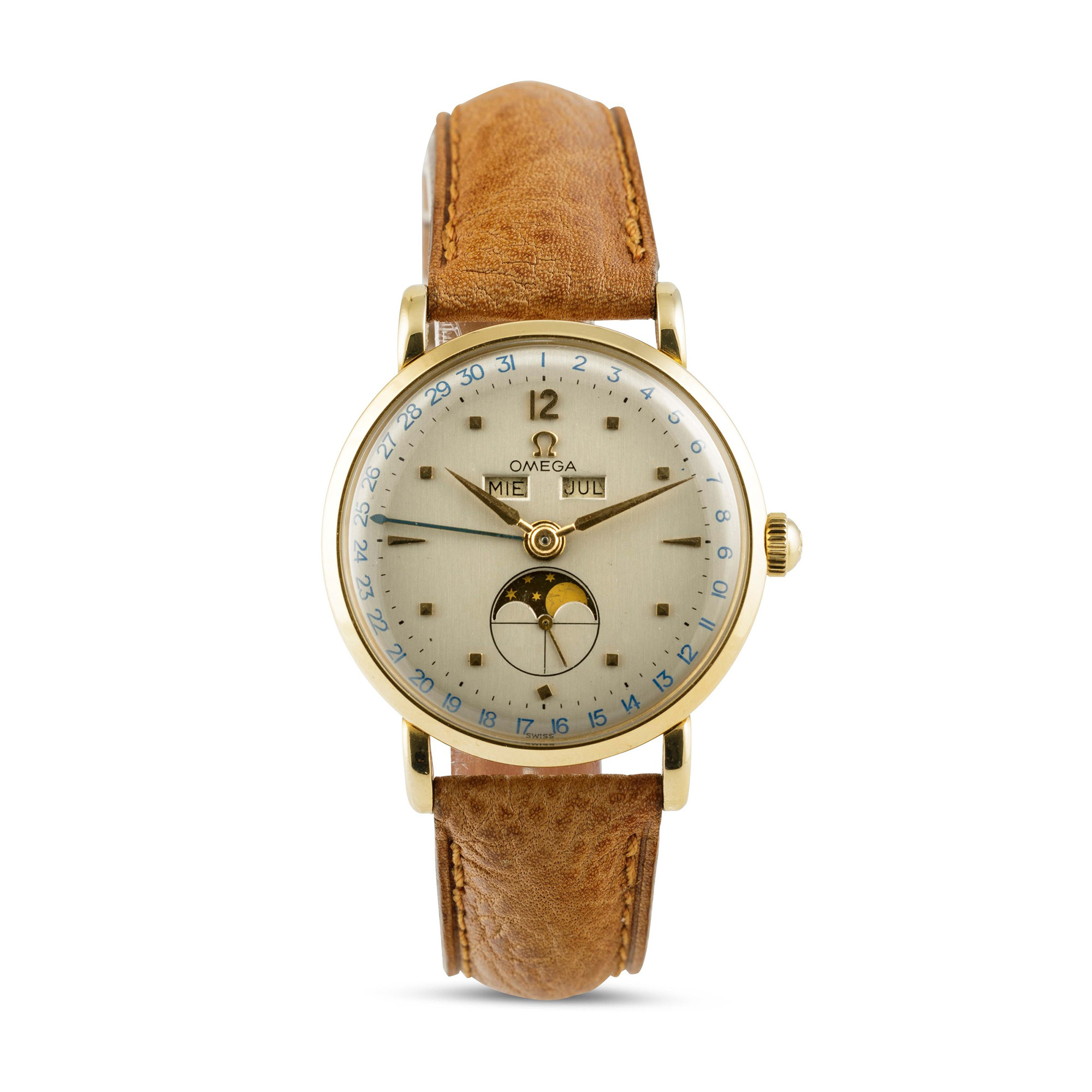 Lotto 190 | OMEGA - Cosmic triplo calendario con fasi lunari, in oro 18k, anse a goccia, anni '40. (Quadrante ristampato)