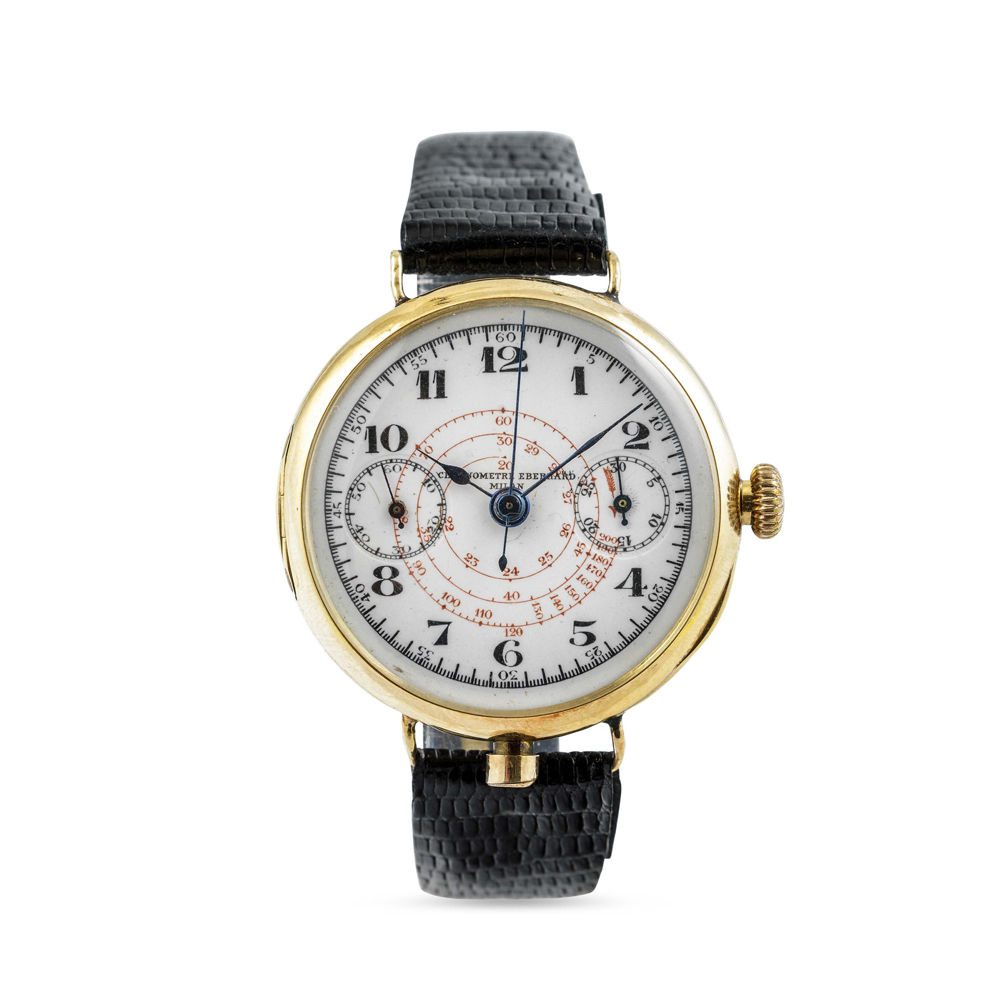 Cronografo monopulsante anonimo per "Eberhard Milano", cassa in oro 18k oversize con scala tachimetrica e numeri Breguet.