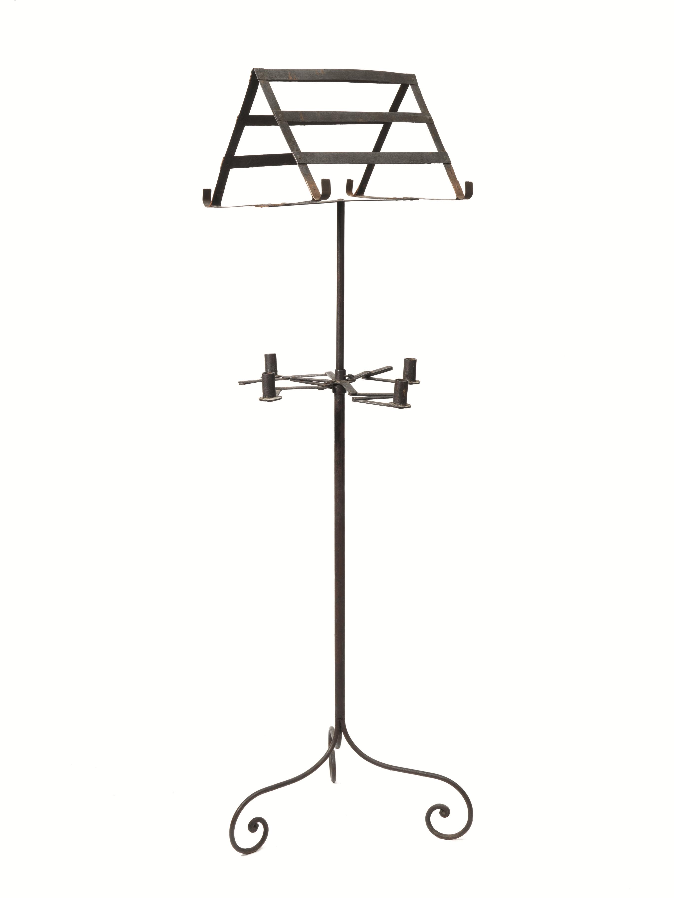 Leggio, sec. XIX, in ferro battuto e lamierina, parte superiore a doppio leggio, fusto con quattro bracci portacandela pieghevoli, base tripode, alt. cm 134