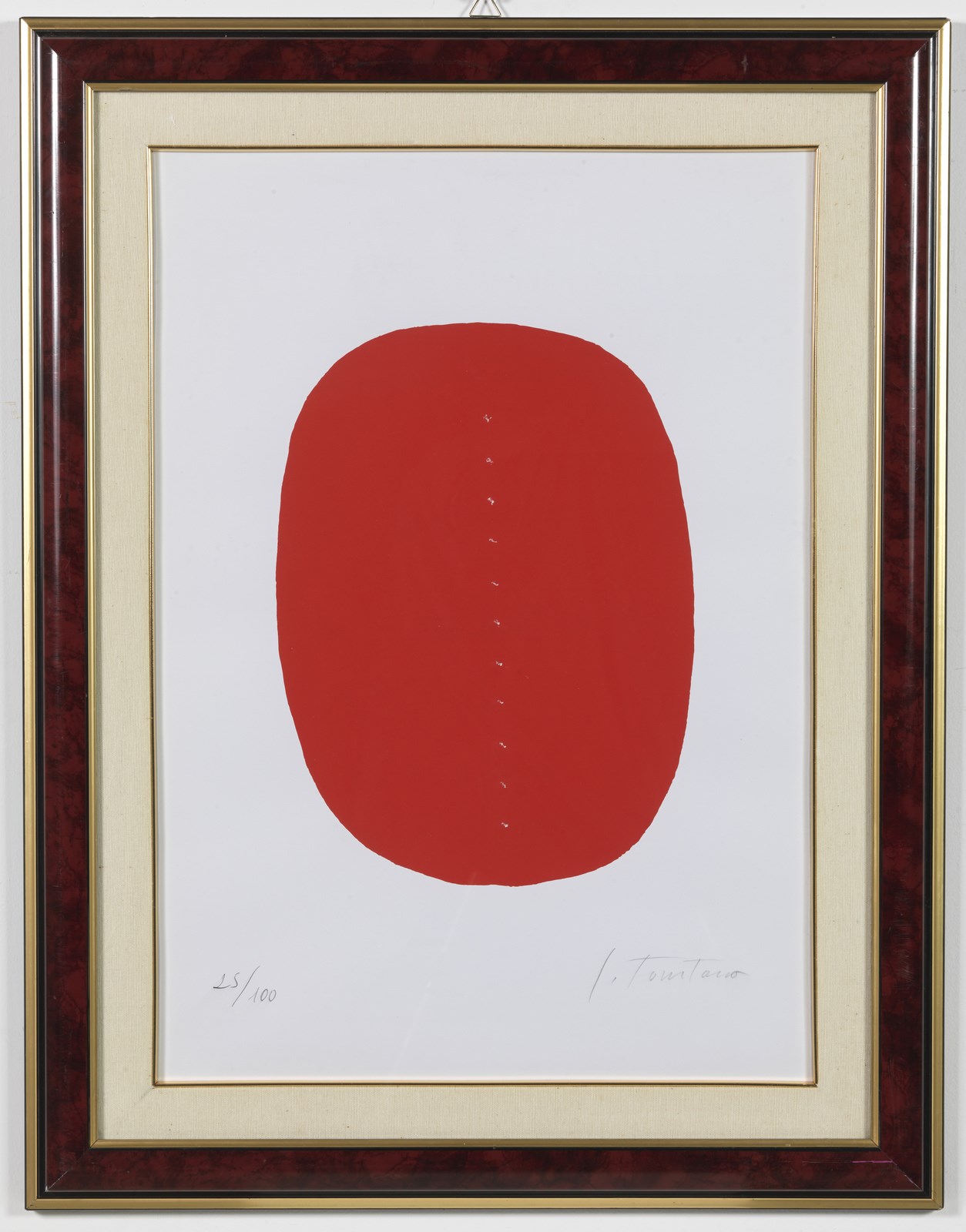 FONTANA LUCIO (1899 - 1960) Concetto spaziale. 1965. Serigrafia. Cm 50,00 x 70,00. 25/100. Serigrafia stampata in rosso con buchi.Tiratura e firma in basso a matita. Pubblicazione: Lucio Fontana. Incisioni, grafica, multipli, pubblicazioni... a cura di Harry Ruhé e Camillo Rigo, Reverdito Editore, 2007, S-3, p.121. Edizione totale: 10 A.p. firmati e numerati - Gallerie Kasper, Losanna Editore; edizione in numeri arabi non pubblicata dalla Gallerie Kasper, Losanna ( si veda il catalogo generale per maggiori dettagli). Cornice presente