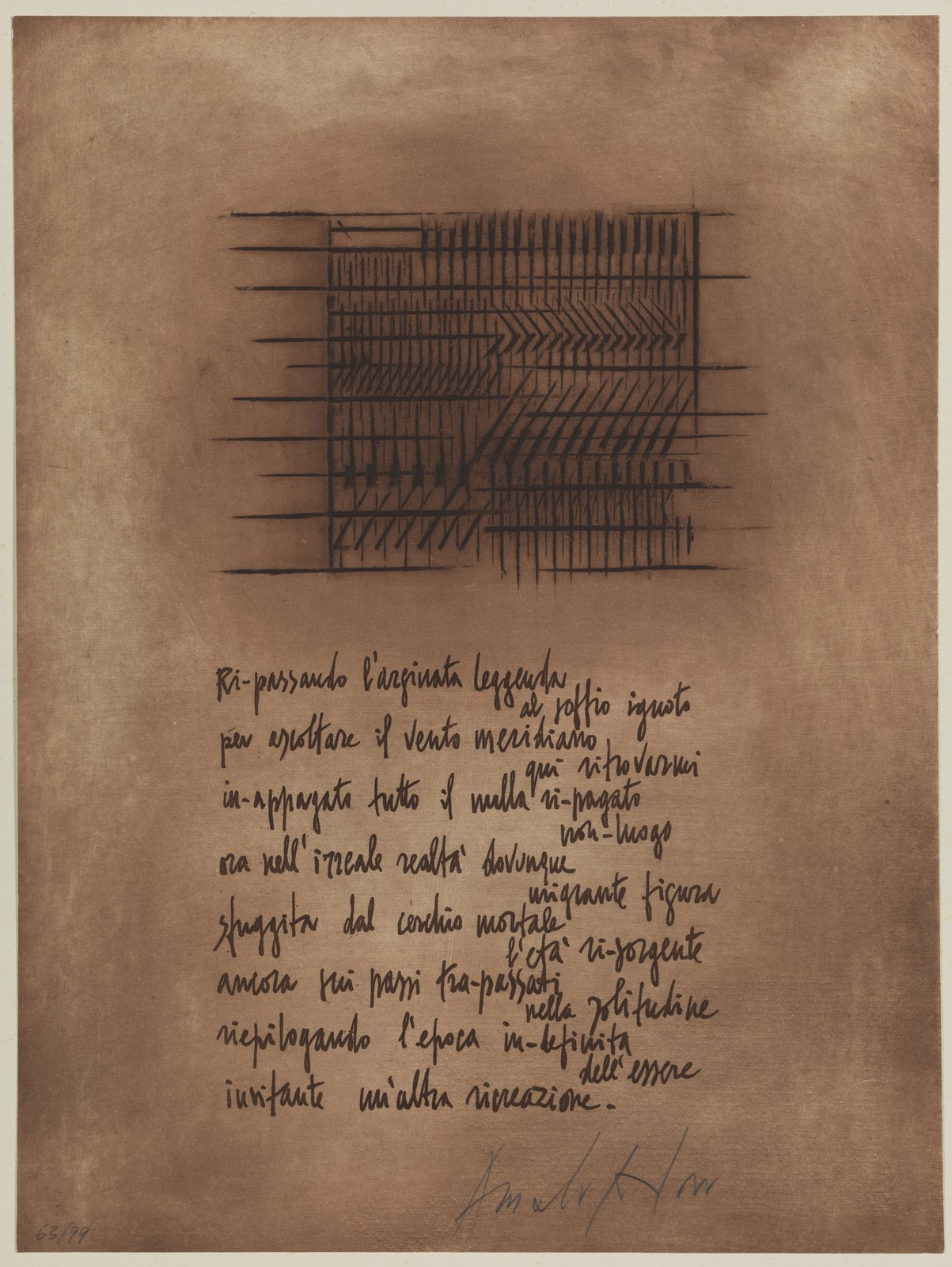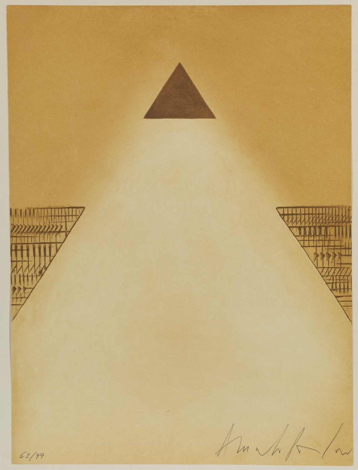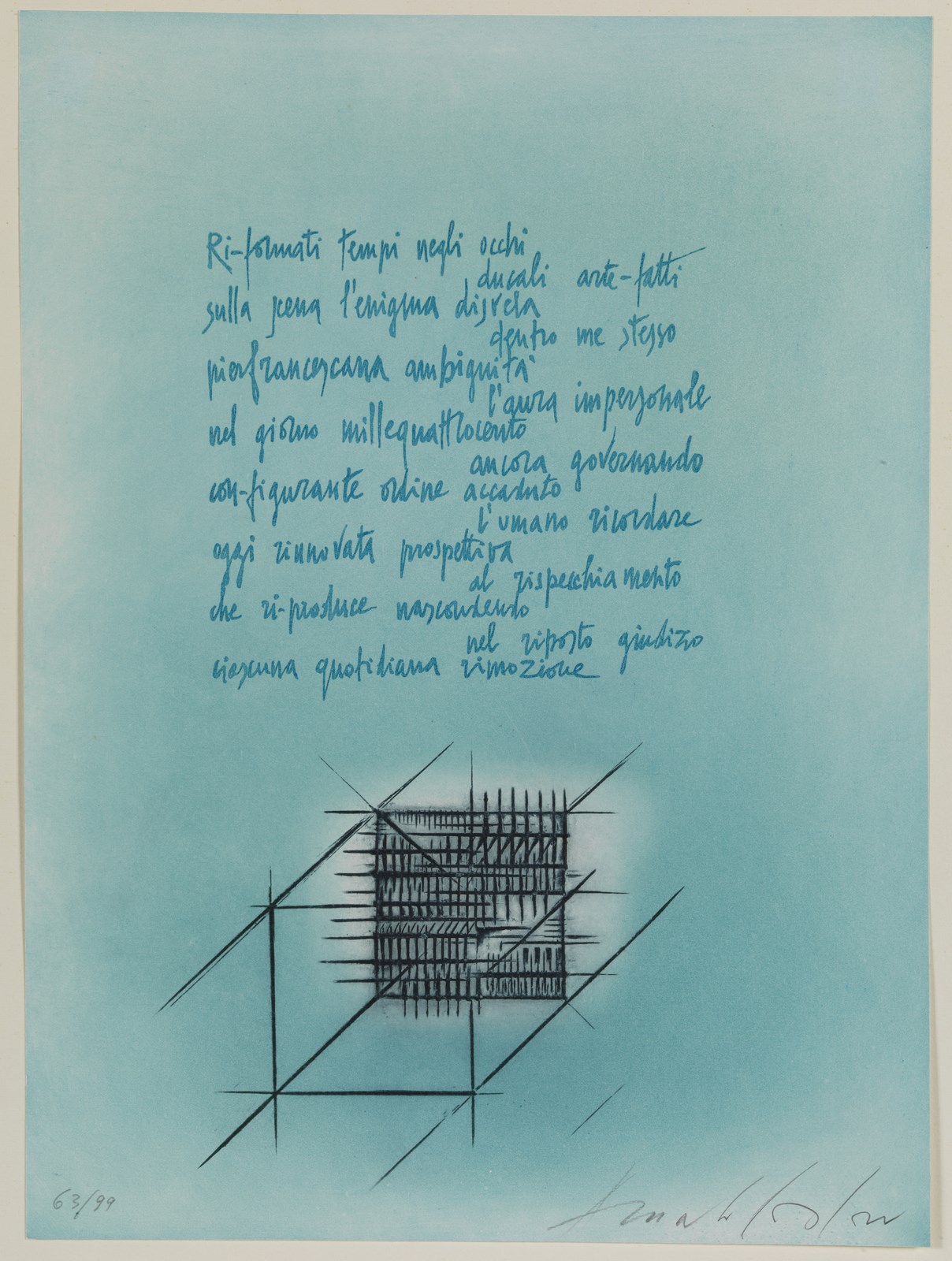 POMODORO ARNALDO (n. 1926) Lotto composto da n.8 fogli. Calcografia. Cm 50,00 x 60,00. 63/99. Dalla cartella ' De Cantare Urbino'. Ogni foglio presenta tiratura e firma in basso a matita. Dimensione lastra: 45.5x33.5 cm. Edizione totale: 130 esemplari di cui 99 in numeri arabi, 25 numeri romani e 6 segnati con le lettere dell’alfabeto destinati “ad personam”. Carta Magnani. Giulio Serafini stampatore. Edizione La Pergola, Pesaro. Lievi difetti. Colophon presente. La cartella è priva del contenitore in legno con bassorilevo in bronzo dorato.