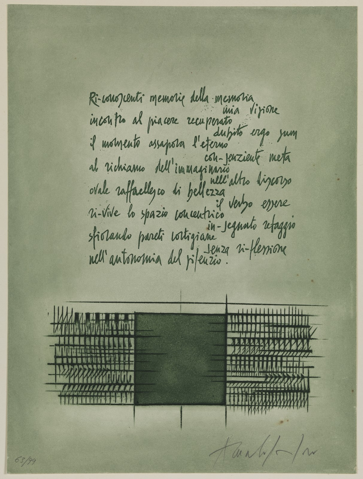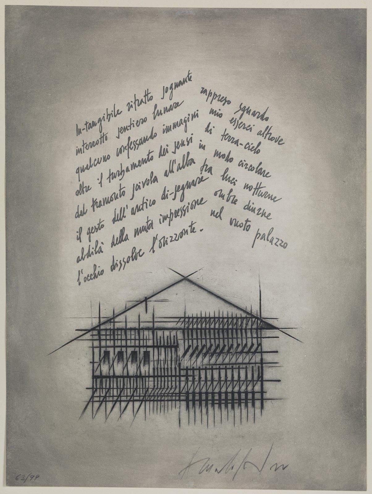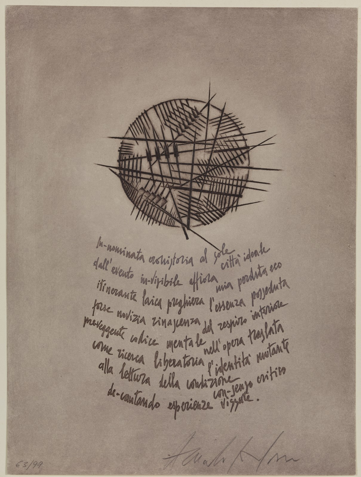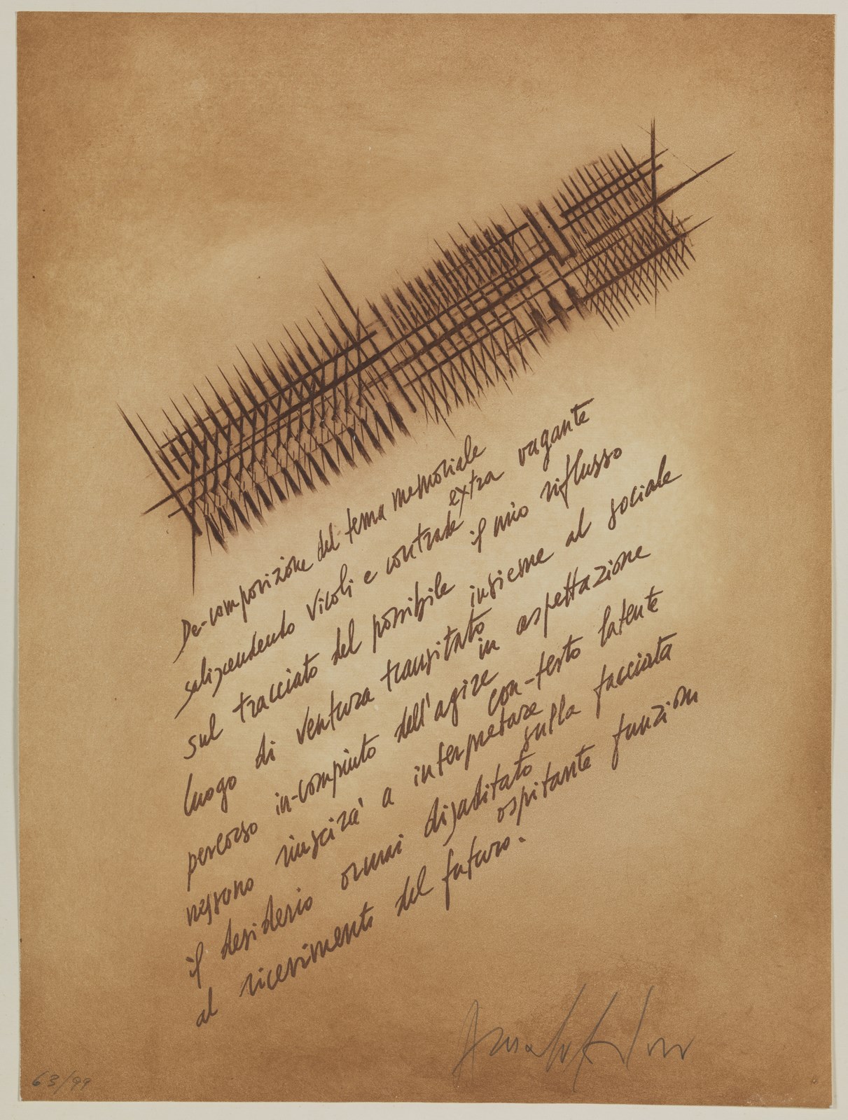 POMODORO ARNALDO (n. 1926) Lotto composto da n.8 fogli. Calcografia. Cm 50,00 x 60,00. 63/99. Dalla cartella ' De Cantare Urbino'. Ogni foglio presenta tiratura e firma in basso a matita. Dimensione lastra: 45.5x33.5 cm. Edizione totale: 130 esemplari di cui 99 in numeri arabi, 25 numeri romani e 6 segnati con le lettere dell’alfabeto destinati “ad personam”. Carta Magnani. Giulio Serafini stampatore. Edizione La Pergola, Pesaro. Lievi difetti. Colophon presente. La cartella è priva del contenitore in legno con bassorilevo in bronzo dorato.