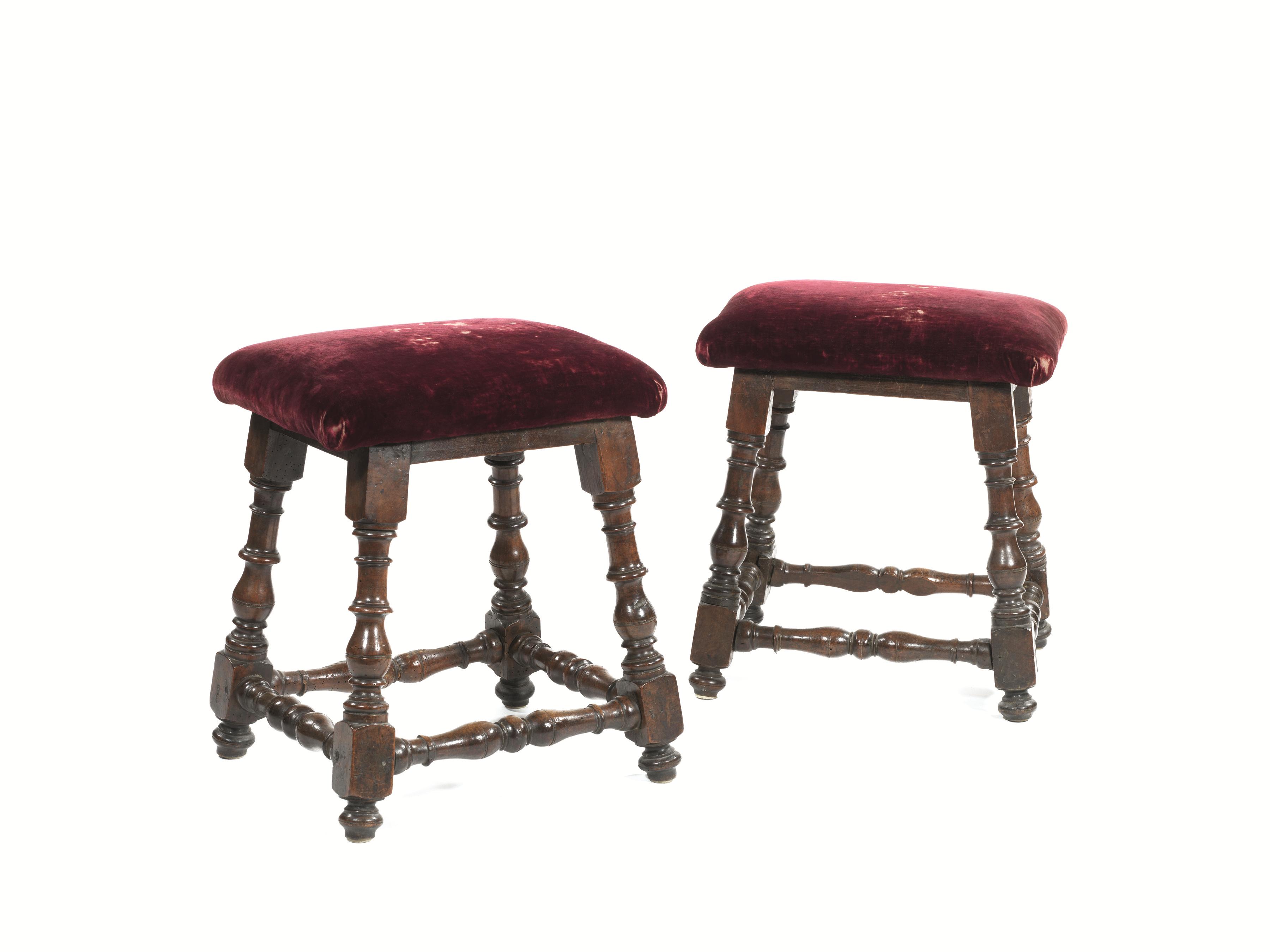 Coppia di panchetti, fine sec. XVII, in noce tornito, gambe e traverse a