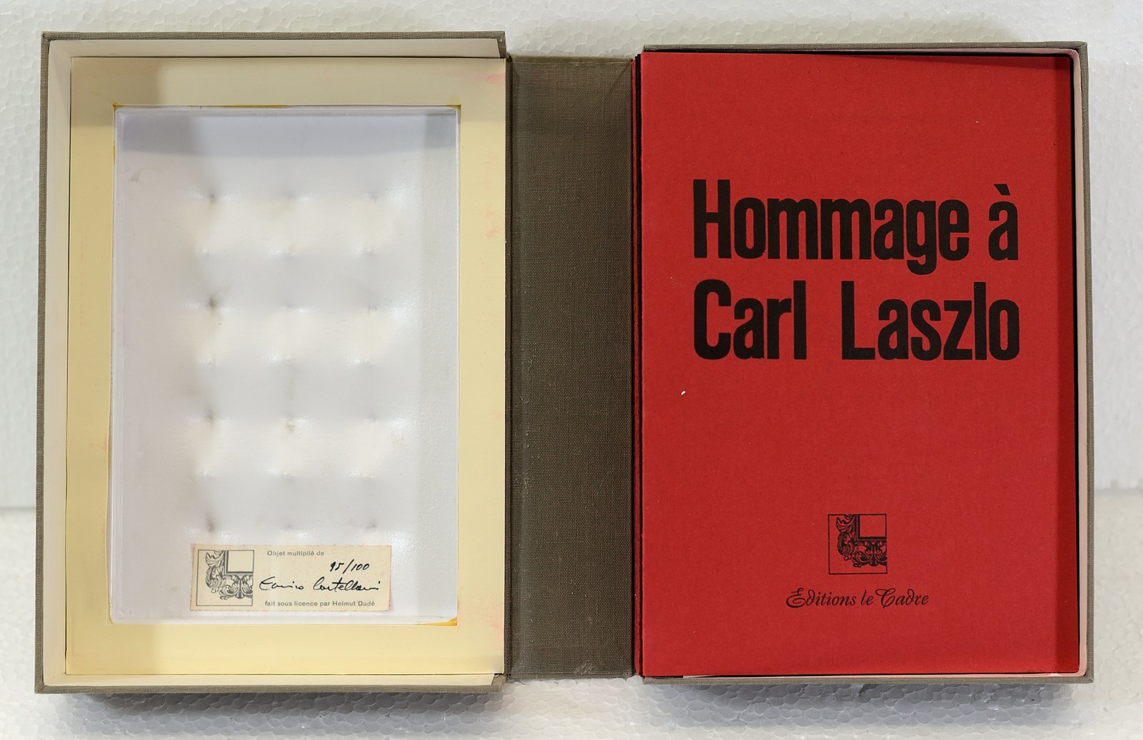 ARTISTI VARI Hommage à Carl Laszlo. 1972. Acrilico, specchio, smalto,resina, oggetti.. Cm 15,50 x 22,00 x 7,00. 95/100. Edizione Le Cadre 1972. Realizzato in occasione del 45 ° compleanno dell'editore e critico d'arte di Basilea C.Laszlo, con contributi di G. Alviani, Arman, C.Belloli, G. Biasi, E. Castellani, G.Colombo, W. Dexel, J.Vandyken, G.Errò, G. Fruhtrunk, P.Scheggi, H. Hanko, L. Kassák, M. Kutter, Y. Laloy, M. Morandini e molti altri. Edizione Totale: 100 esemplari numerati tra cui 35 ad personam e 65 in commercio. Sulla copertina è presente un multiplo in resina di Enrico Castellani e di Arman.