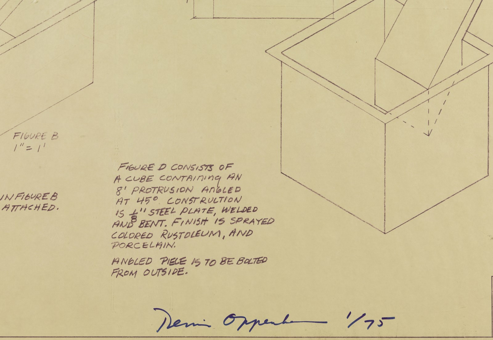 OPPENHEIM DENNIS (1938 - 2011) Escavated structures. Serigrafia. Cm 94,00 x 63,00. 1/75. Tiratura e firma a pennarello in basso a destra. Al retro timbro Studio oggetto, Milano. Edizione: Lebeer-Hossmann, Bruxelles, Belgio e Amburgo, Germania. Produzione Jacques Ledoux, Bruxelles. Di questa edizione sono state pubblicate settantacinque copie numerate da 1 a 75 con dieci esemplari Hors Commerce numerati H.C. I a X. Ogni copia comprende 62 grafiche stampate in scala 1:1 in conformità ai disegni originali su carta. Rappresentano la totalità dei progetti di Dennis Oppenheim concepiti tra il 1967 e il 1974 e sono raggruppati in quattro serie : 1967 (serie Blue); 1967-1968 (serie Seppia); 1969-1971 (serie nera); 1971-1974 (serie rossa).