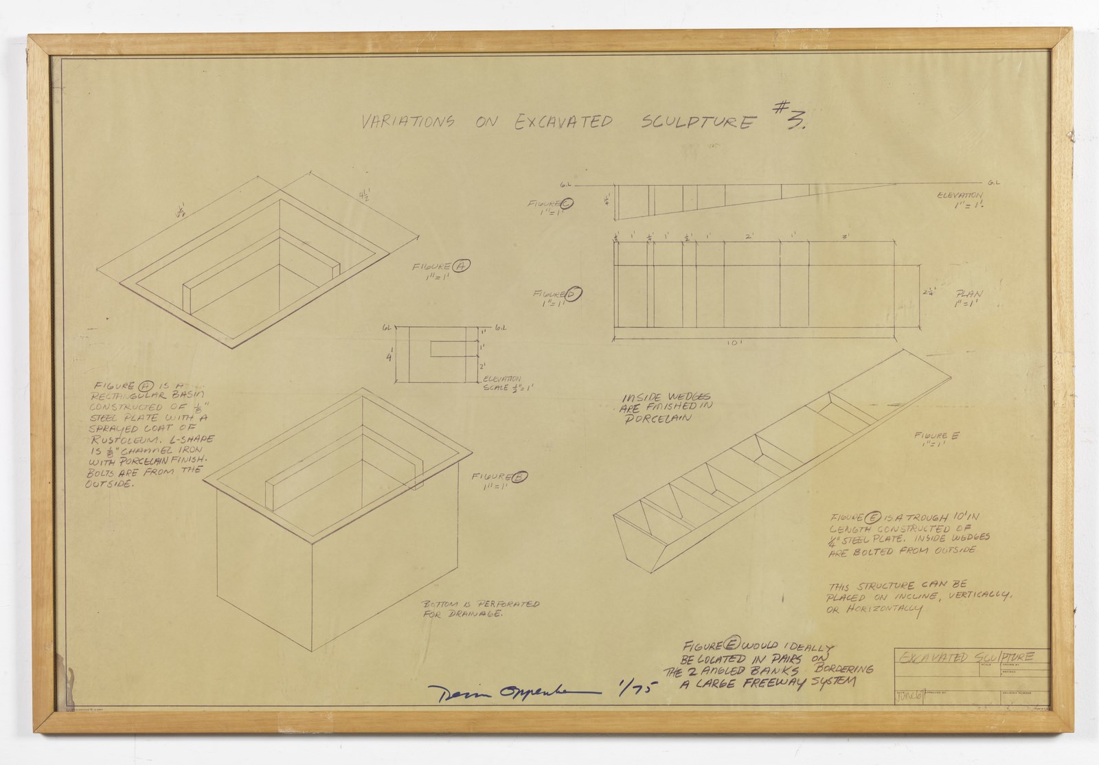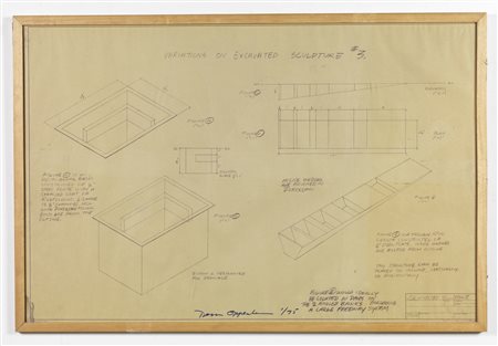 OPPENHEIM DENNIS (1938 - 2011) Variation on excavated sculptures. 1967. Serigrafia. Cm 94,00 x 63,00. 1/75. Tiratura e firma a pennarello in basso al centro. Al retro timbro Studio oggetto, Milano. Edizione: Lebeer-Hossmann, Bruxelles, Belgio e Amburgo, Germania. Produzione Jacques Ledoux, Bruxelles. Di questa edizione sono state pubblicate settantacinque copie numerate da 1 a 75 con dieci esemplari Hors Commerce numerati H.C. I a X. Ogni copia comprende 62 grafiche stampate in scala 1:1 in conformità ai disegni originali su carta. Rappresentano la totalità dei progetti di Dennis Oppenheim concepiti tra il 1967 e il 1974 e sono raggruppati in quattro serie : 1967 (serie Blue); 1967-1968 (serie Seppia); 1969-1971 (serie nera); 1971-1974 (serie rossa).