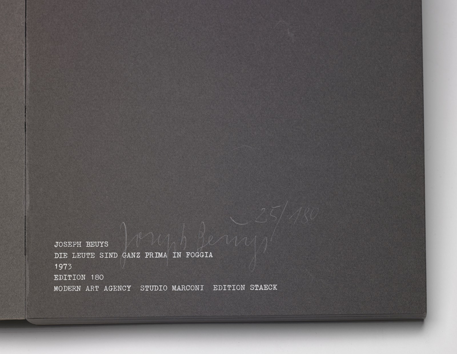BEUYS JOSEPH (1921 - 1986) Die leute sind ganz prima in Foggia. 1973. Libro d'artista. Cm 22,00 x 31,00 x 2,50. 25/180. Libro d’artista composto da 75 tavole serigrafate.Tiratura e firma a matita all'interno della copertina. Edizione totale: 180 + XL esemplari. Editore: Modern Art Agency, Napoli; Studio Marconi, Milano; Edition Staeck, Heidelberg. Pubblicazione: Catalogo ragionato dei multipli “Joseph Beuys. Die Multiples”,Schellmann, n.100. Provenienza: Collezione Lucio Amelio, Napoli; Collezione privata, Napoli.