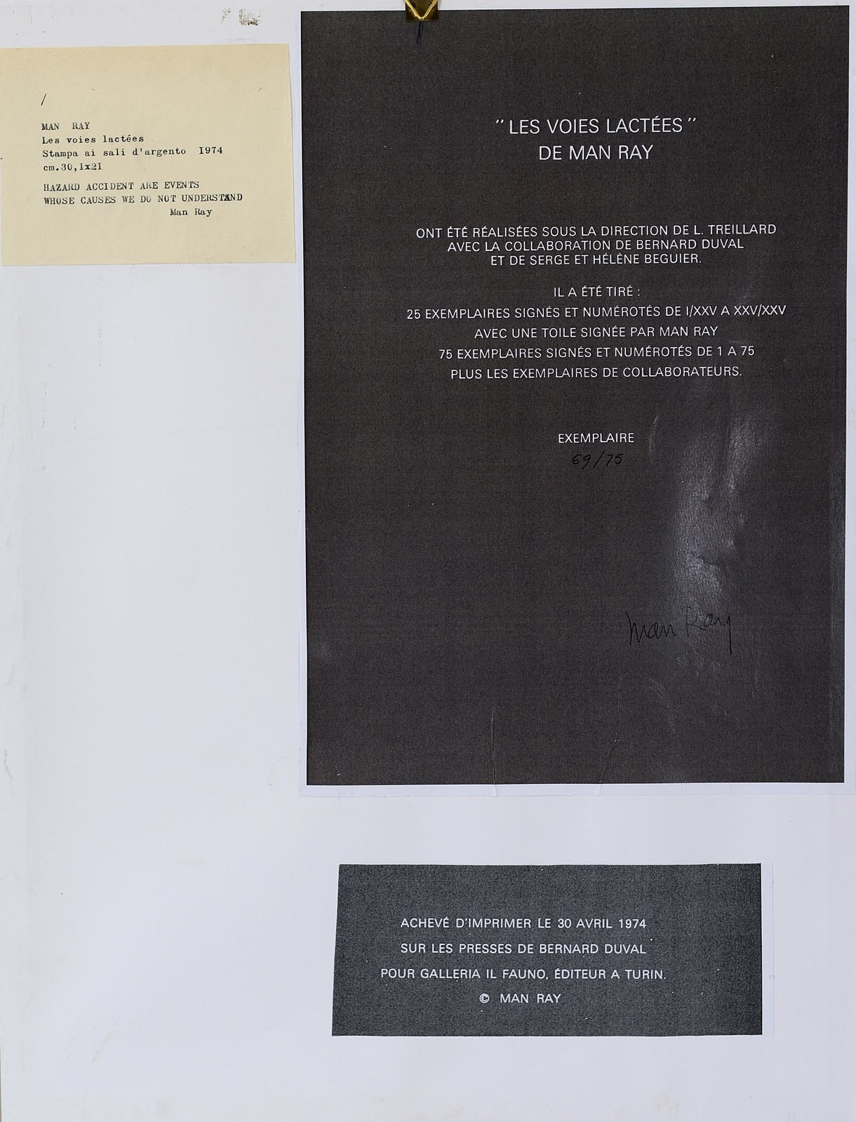 MAN RAY (1890 - 1976) Les Voies lactées. 1974. stampa ai sali d'argento. Cm 21,00 x 30,10. 69/75. Edizione per la Galleria Il Fauno, Torino 1974. Edizione totale: 75 esemplari in numeri arabi +XXV esemplari in numeri romani. Lotto proveniente dal portfolio Les Voies Lactées contente 11 fotografie ai sali d'argento. Al retro timbro Man Ray, Paris. Cornice presente