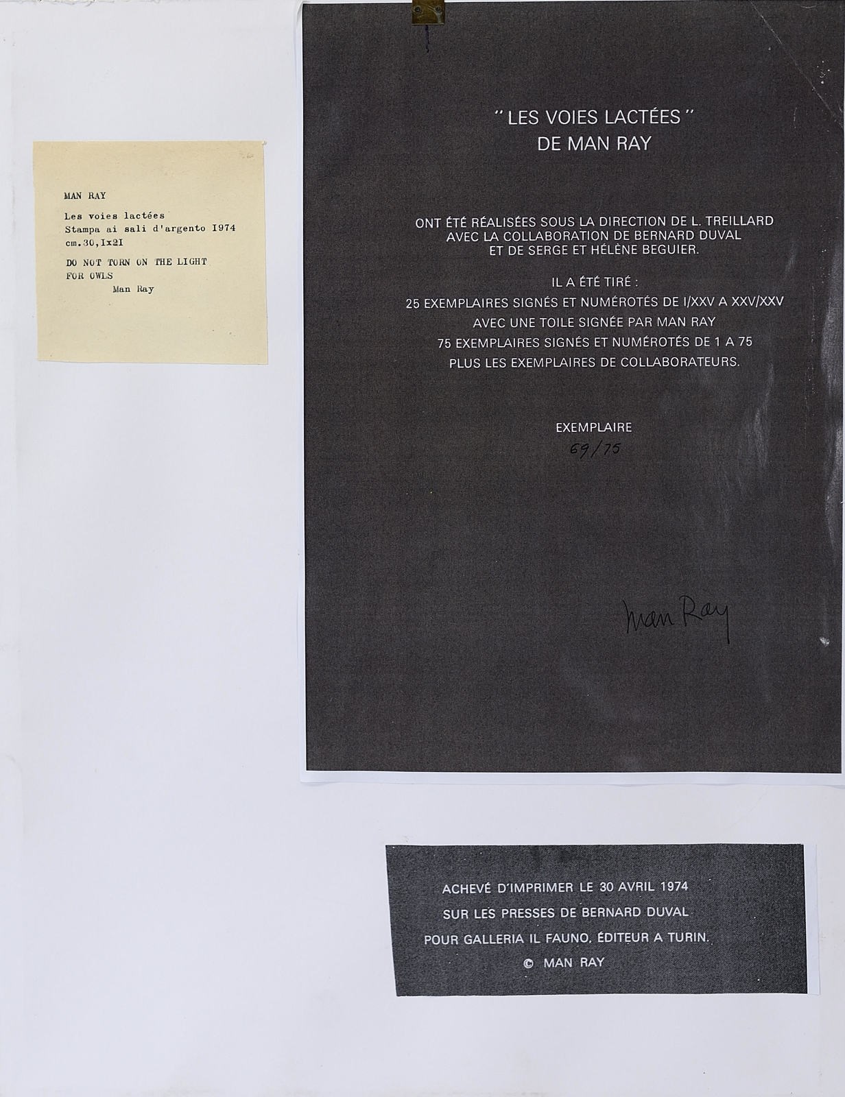 MAN RAY (1890 - 1976) Les Voies lactées. 1974. stampa ai sali d'argento. Cm 21,00 x 30,10. 69/75. Edizione per la Galleria Il Fauno, Torino 1974. Edizione totale: 75 esemplari in numeri arabi +XXV esemplari in numeri romani. Lotto proveniente dal portfolio Les Voies Lactées contente 11 fotografie ai sali d'argento. Al retro timbro Man Ray, Paris. Cornice presente