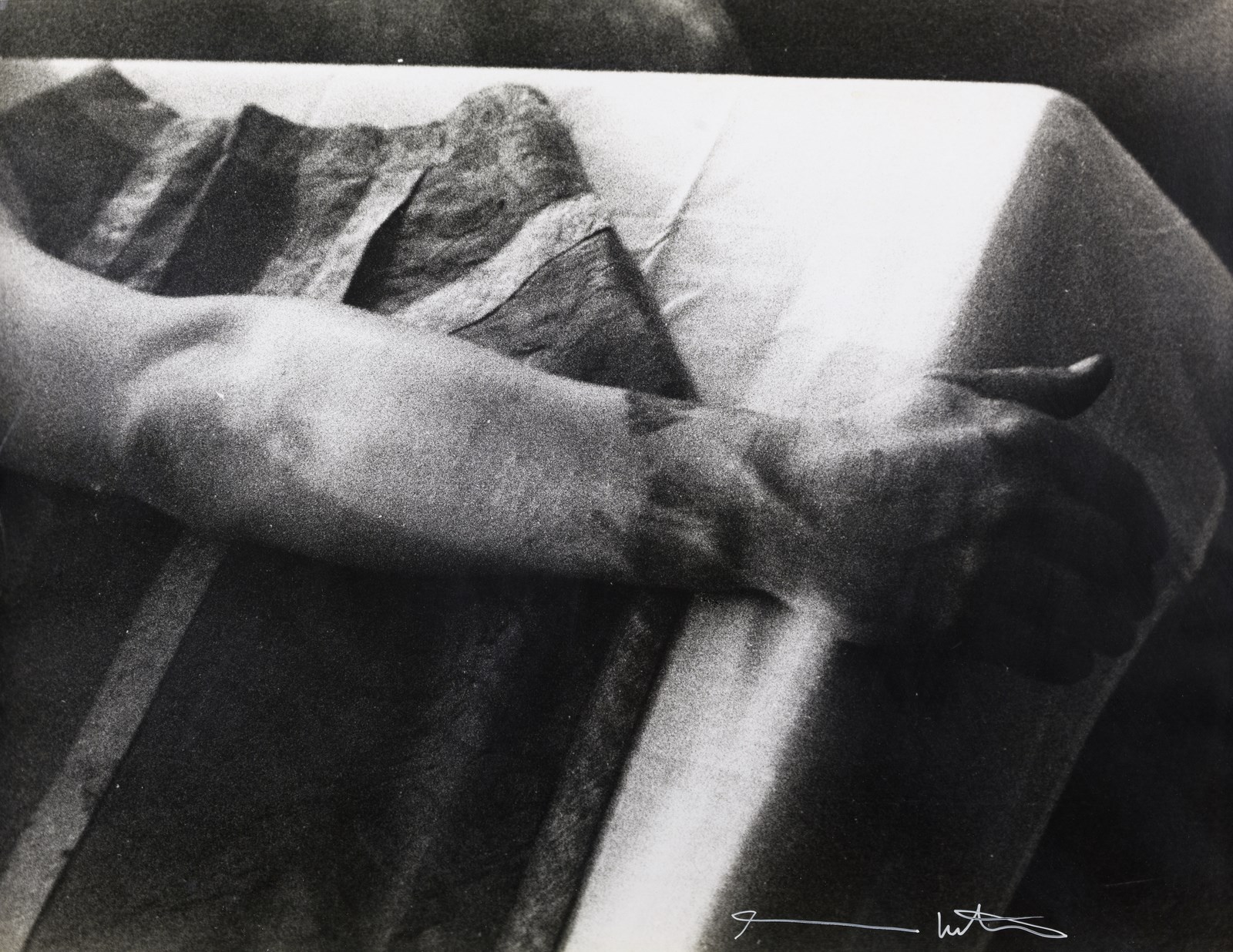 NITSCH HERMANN (n. 1938) Aktion n.50. 1975. Fotografia in bianco e nero. Cm 60,00 x 50,00. Firma in basso a destra. Al retro timbro O.M.Theater Hermann Nitsch, credito Mario Parolin, Cittadella e timbro Archivio Francesco Conz, Verona. Certificato di provenienza Artesegno Casa d'aste, Udine. Cornice presente
