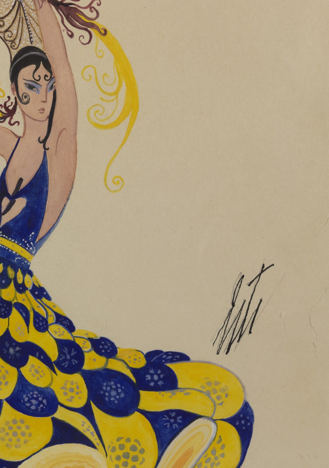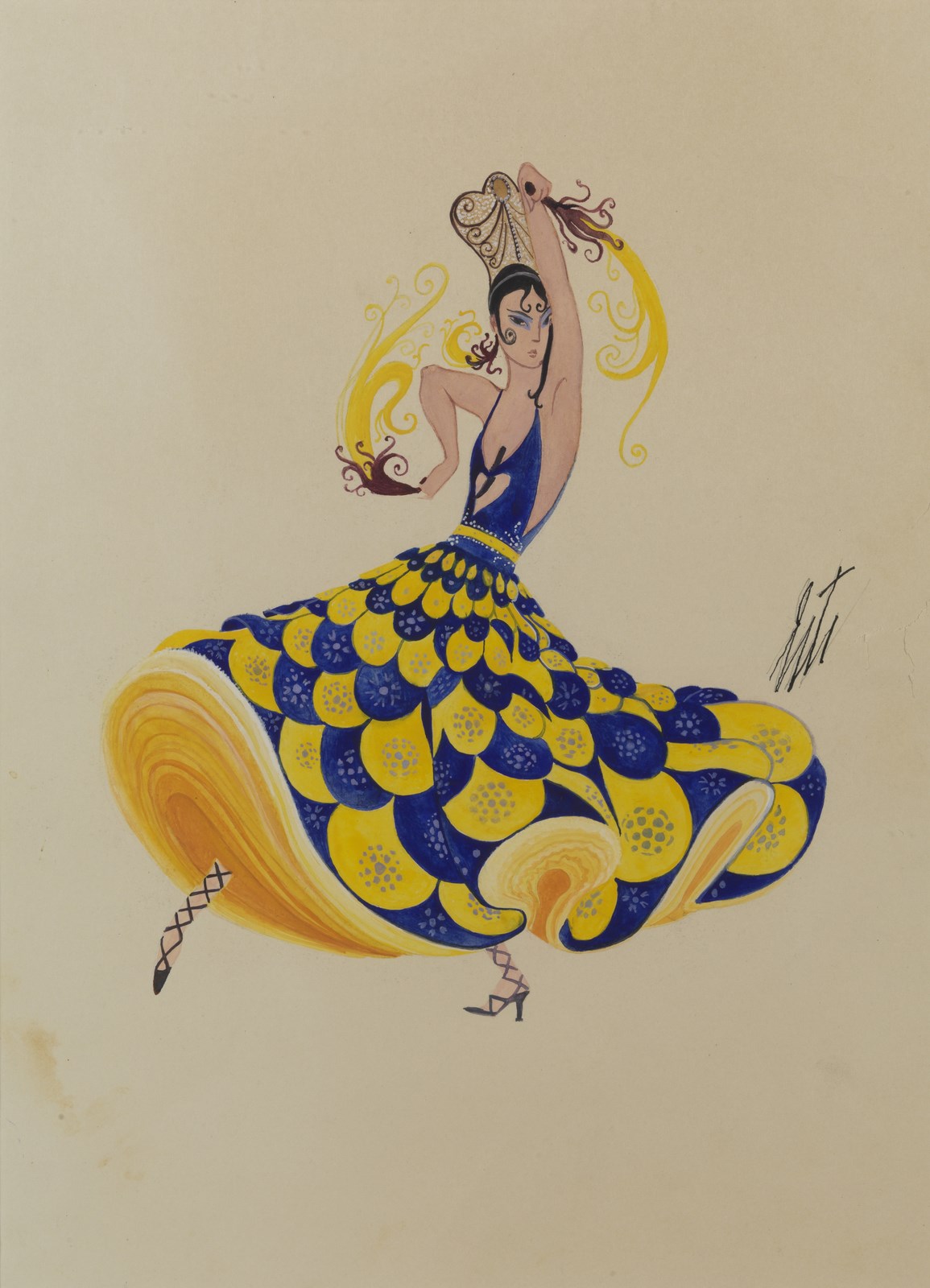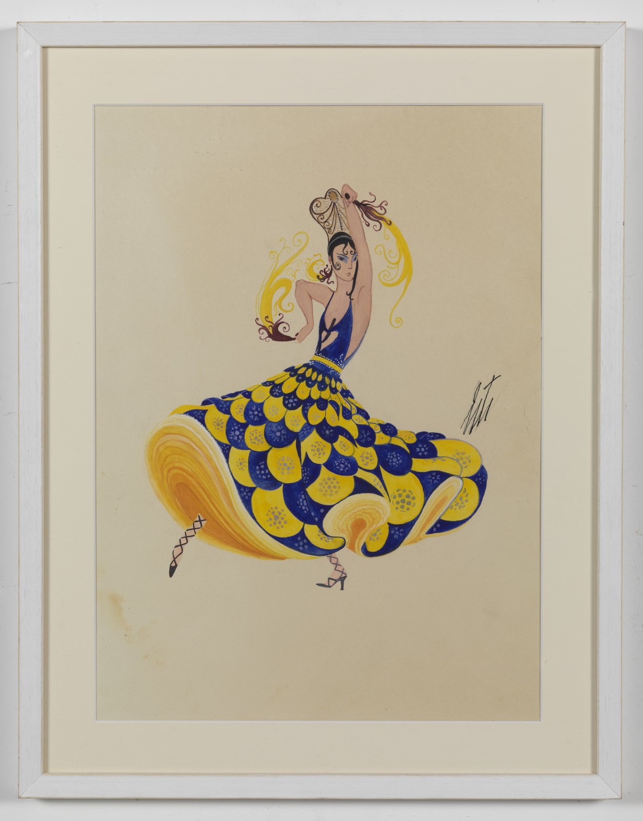 (ROMAIN DE TIRTOFF) ERTE' (1892 - 1990) Ballerina spagnola. Tecnica mista su carta. Cm 28,50 x 40,00. Firma in alto a destra. Difetti. Cornice presente