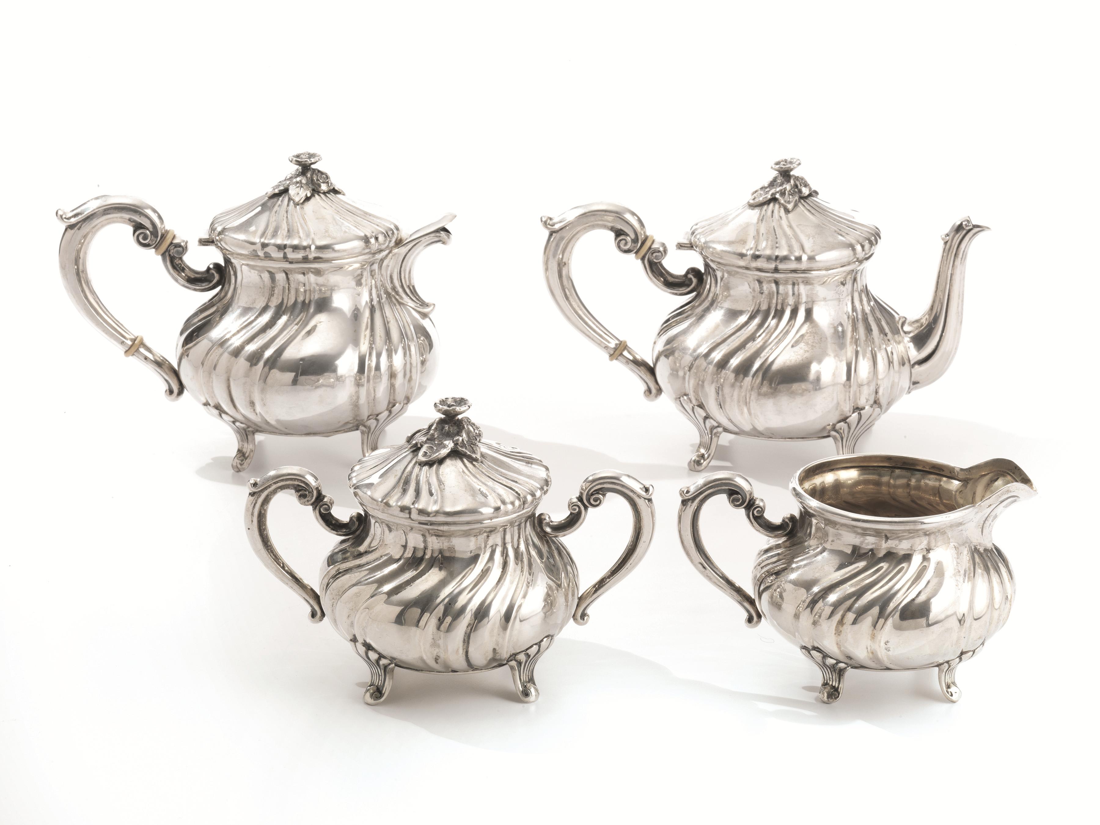 Caffettiera alla turca, in metallo argentato, corpo inciso e cesellato a fiori, quattro piedini modellati ad artigli su sfera, alt. cm 21,5 ed un servito da tè, in argento sbalzato a costolonature oblique, manici a voluta e finali dei coperchi realizzati da boccioli di fiori, composto di due teiere, una lattiera ed una zuccheriera, g 1490 (5)