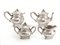 Caffettiera alla turca, in metallo argentato, corpo inciso e cesellato a fiori, quattro piedini modellati ad artigli su sfera, alt. cm 21,5 ed un servito da tè, in argento sbalzato a costolonature oblique, manici a voluta e finali dei coperchi realizzati da boccioli di fiori, composto di due teiere, una lattiera ed una zuccheriera, g 1490 (5)