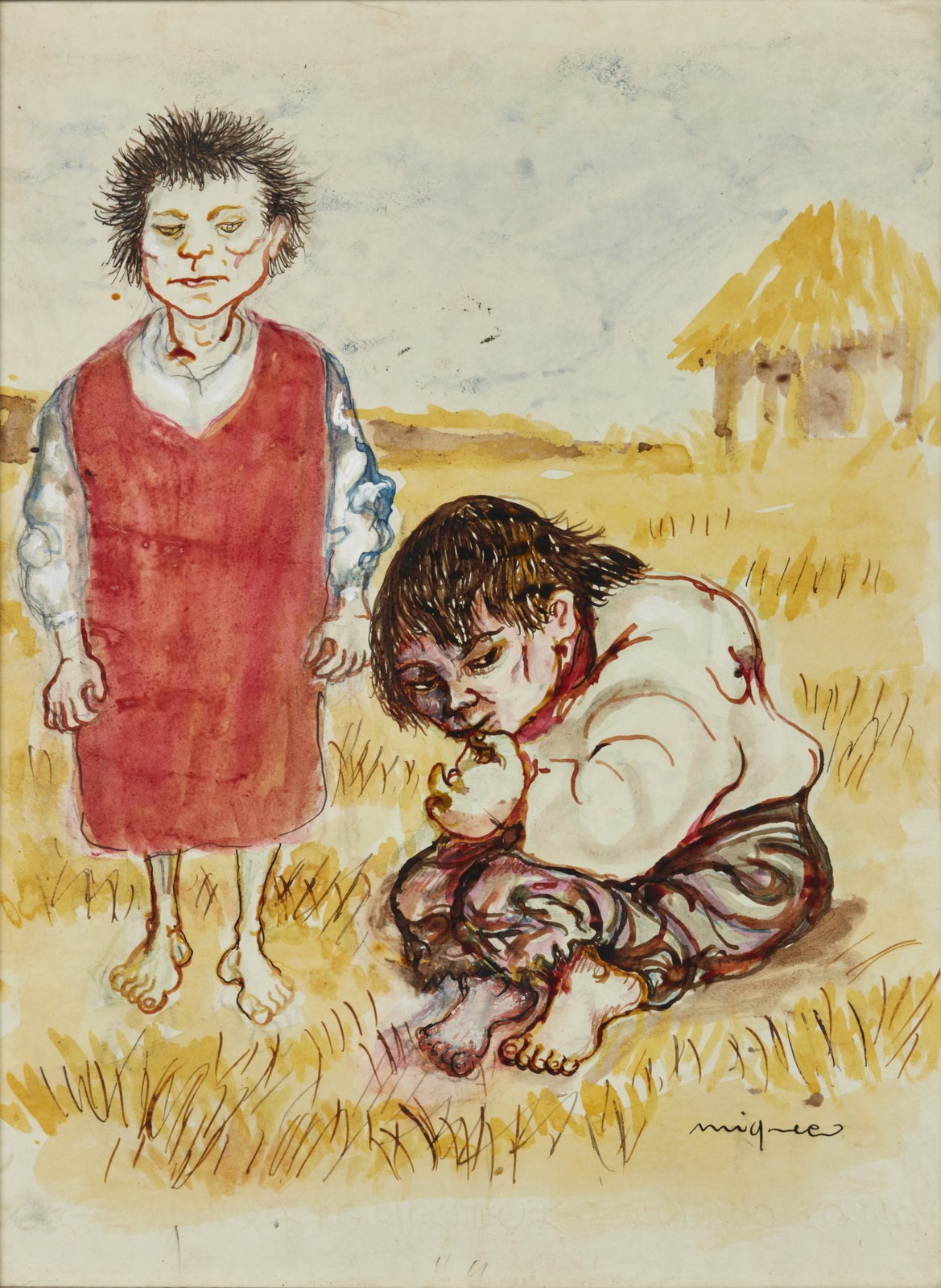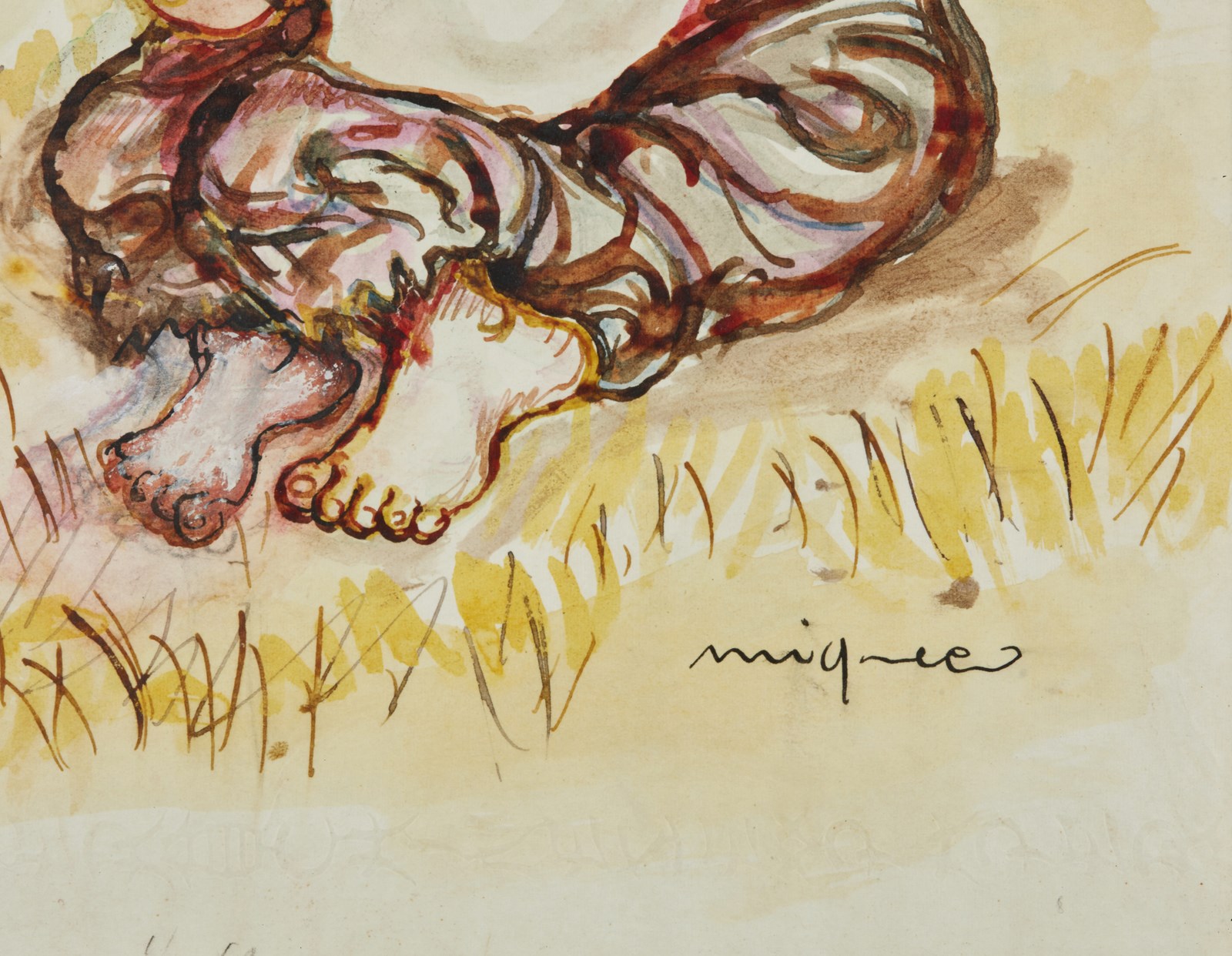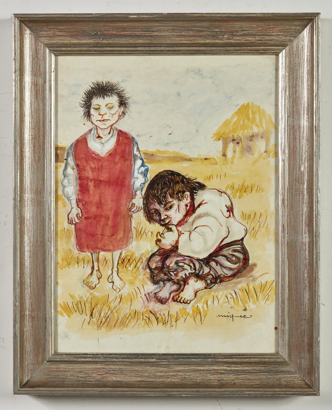MIGNECO GIUSEPPE (1908 - 1997) Due figure sul prato. 1980. Tecnica mista su carta. Cm 30,00 x 40,00. Firma in basso a destra. Autentica dell'artista su fotografia. Opera archiviata presso l'Archivio Giuseppe Migneco - Galleria Bonaparte, Milano, come da documentazione fotografica allegata all'opera riportante il relativo numero d'inventario. Pubblicazione: Migneco. Catalogo generale. Volume II, Bonaparte Editrice, Milano, 1990, p.404. Difetti. Cornice presente