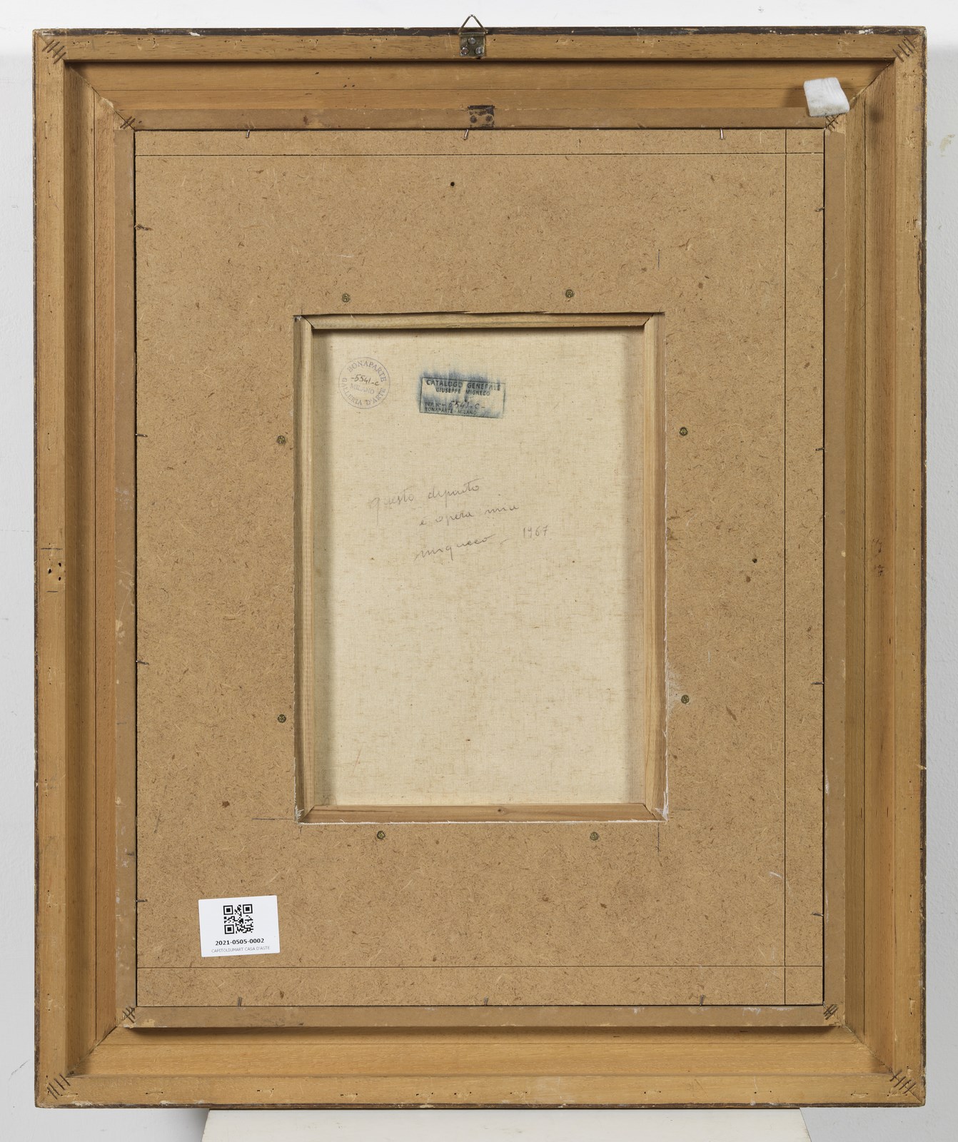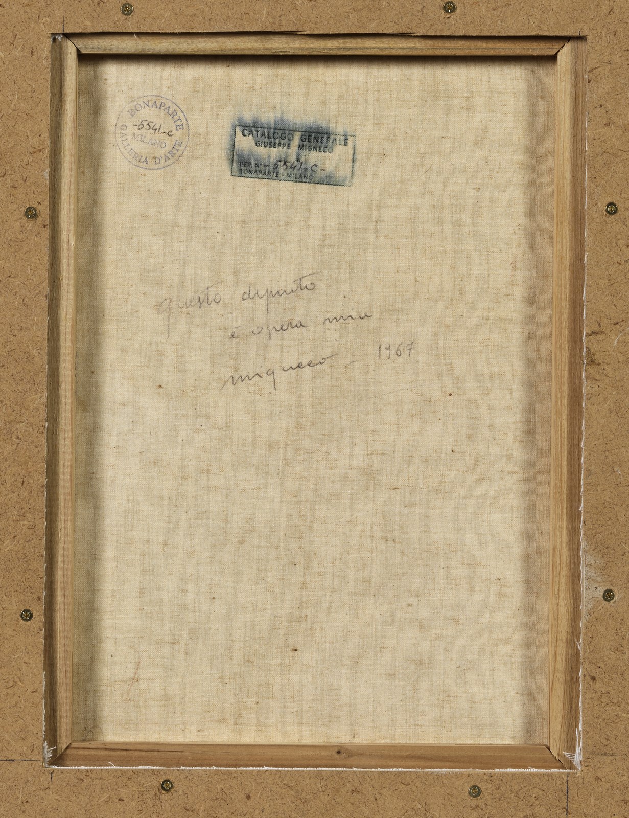 MIGNECO GIUSEPPE (1908 - 1997) Senza titolo. 1967. Olio su tela . Cm 30,00 x 40,00. Firma in basso a destra. Al retro firma, anno e timbro della Galleria Bonaparte, Milano. Opera archiviata presso la Galleria Bonaparte, Milano, come da documentazione fotografica allegata all'opera riportante il relativo numero d'inventario. Lievi difetti. Cornice presente