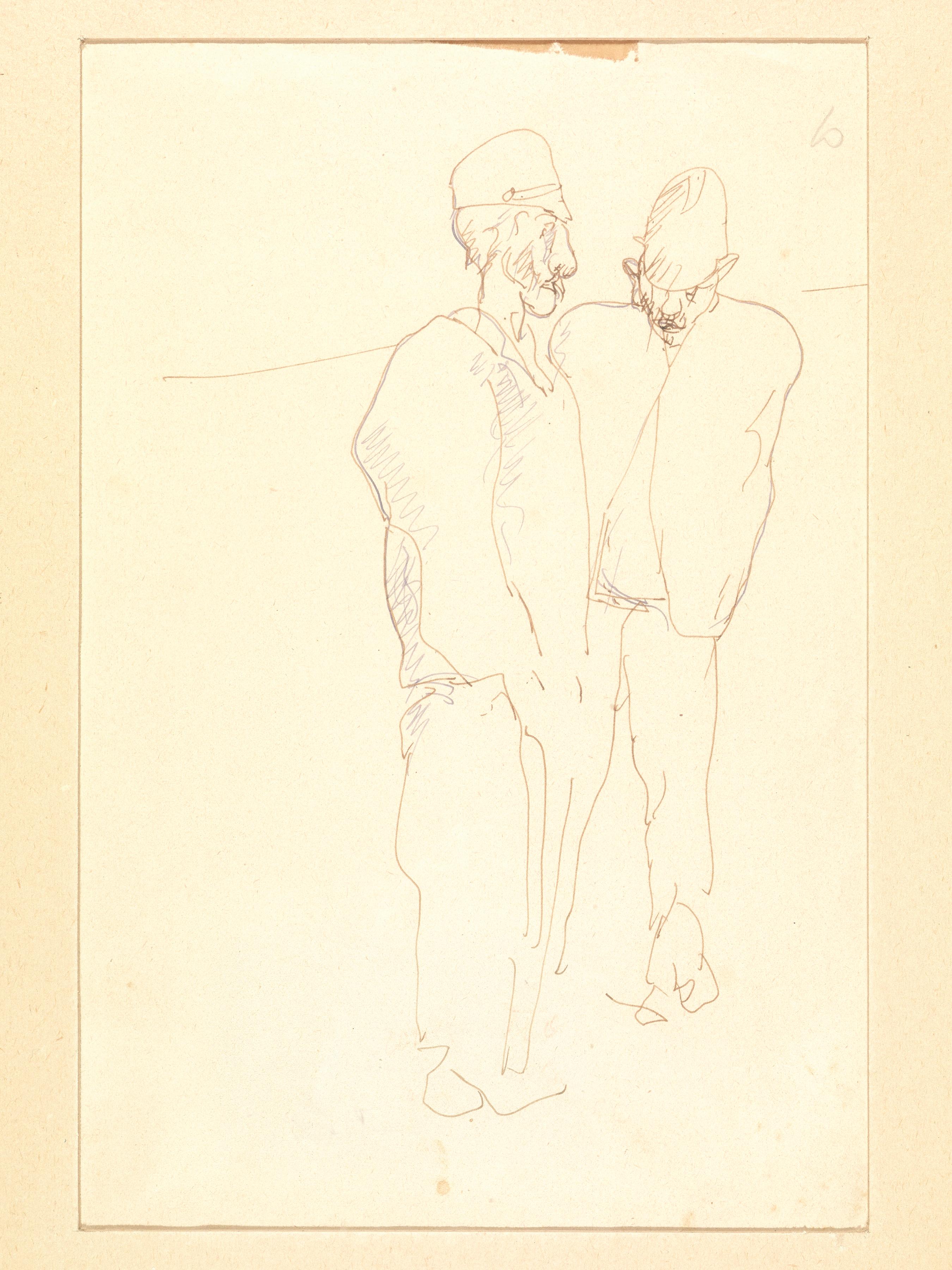 Due figure maschili in piedi. Penna e inchiostro bruno e azzurro. mm