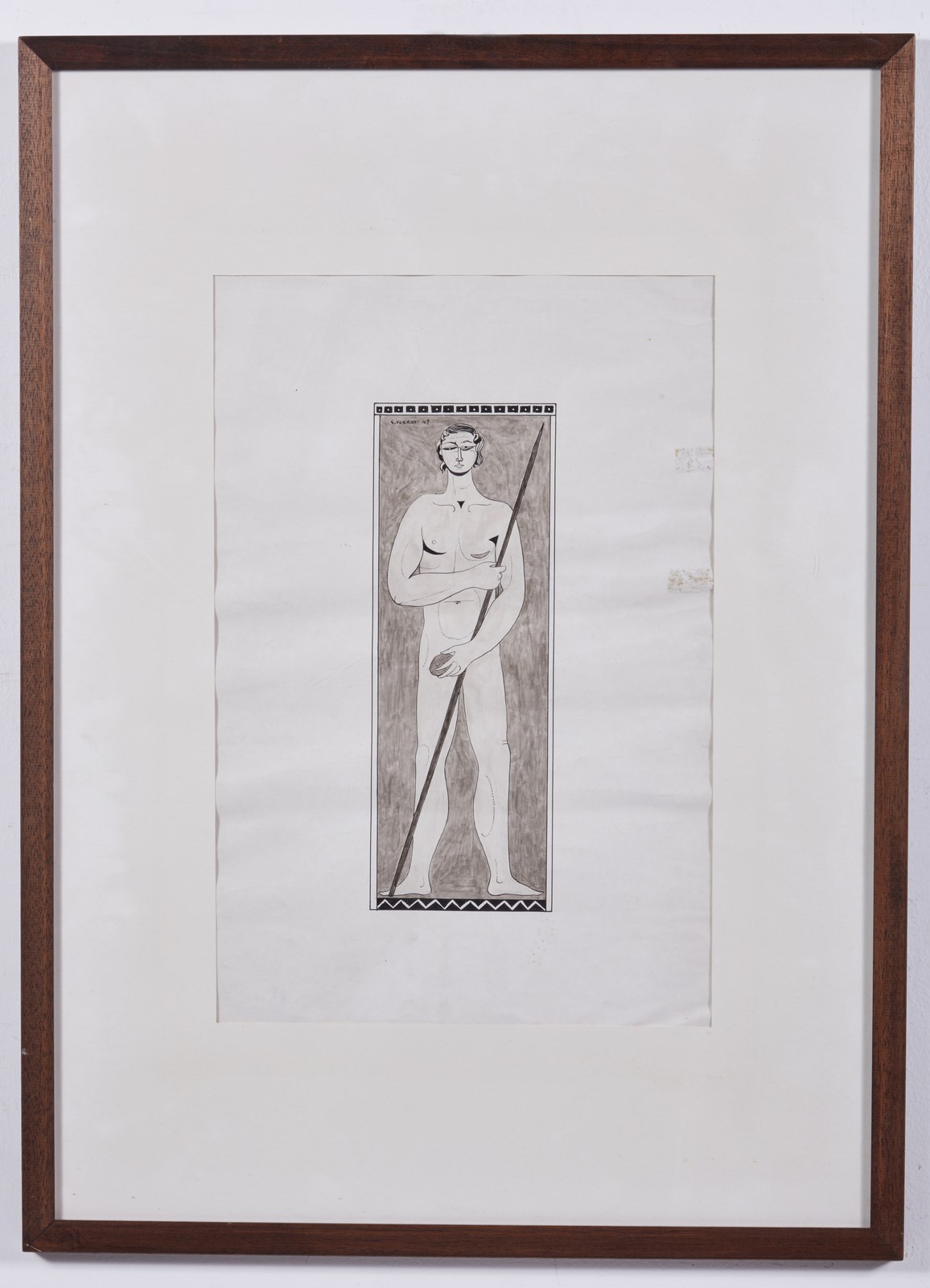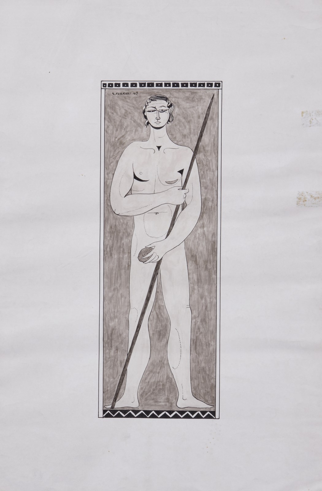 FERRONI GIANFRANCO (1927 - 2001) Senza titolo. Tecnica mista su carta. Cm 30,00 x 45,00. Firma e anno in alto a sinistra. Dimensione disegno: 30x11 cm. Difetti. Cornice presente
