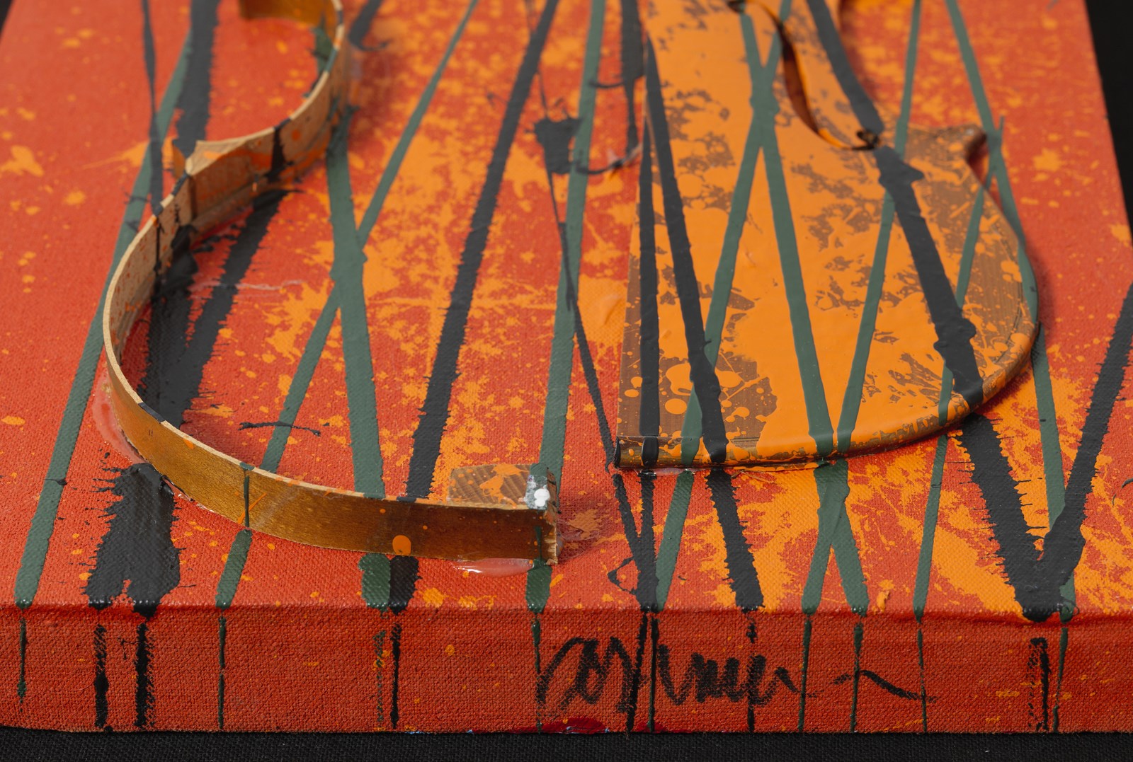 ARMAN FERNANDEZ (1928 - 2005) Senza titolo. 2003. Tecnica mista e applicazioni su tela. Cm 30,00 x 40,00 x 5,50. Firma sul lato inferiore. Opera archiviata presso la Galleria Dante Vecchiato come da documentazione fotografica allegata all'opera riportante il relativo numero d'inventario e la firma dell'artista. Entro teca di plexiglass. Cornice presente