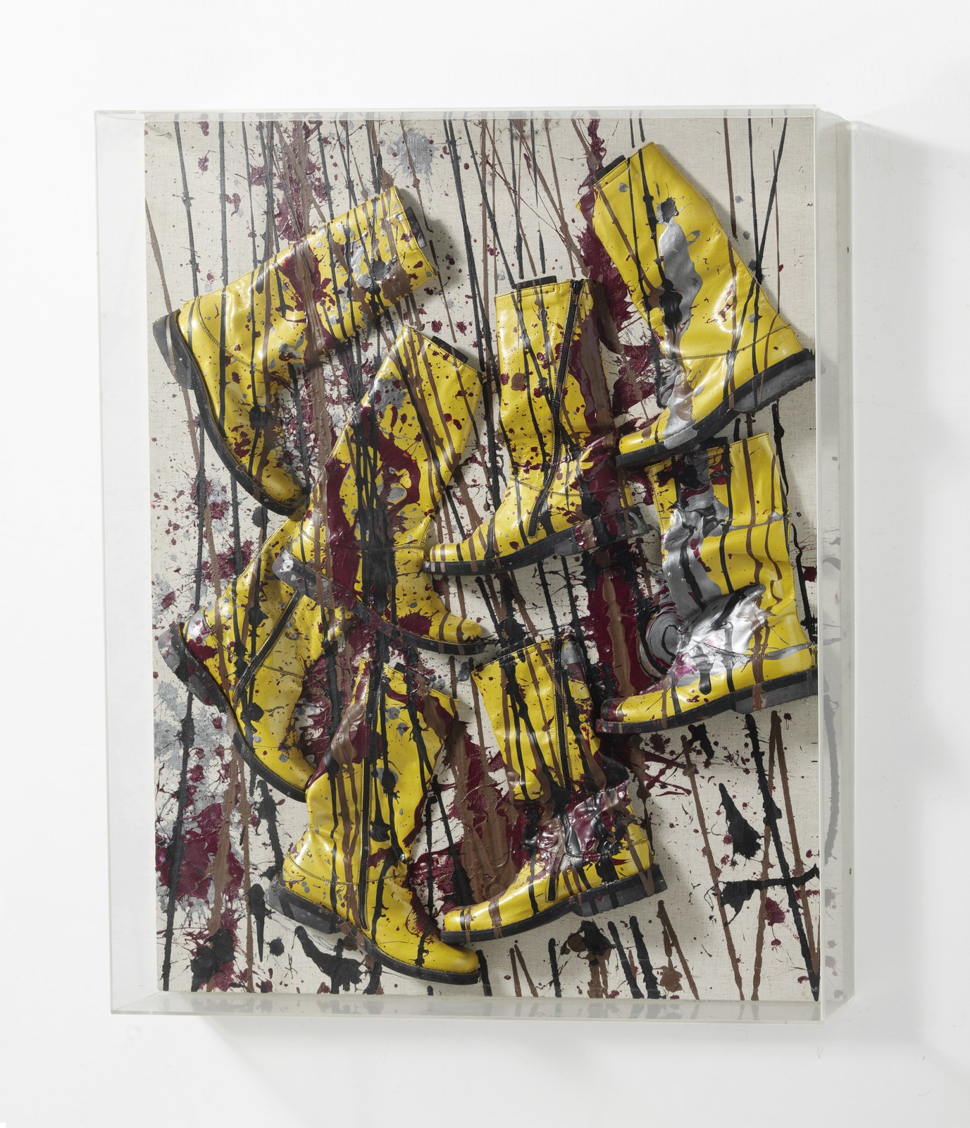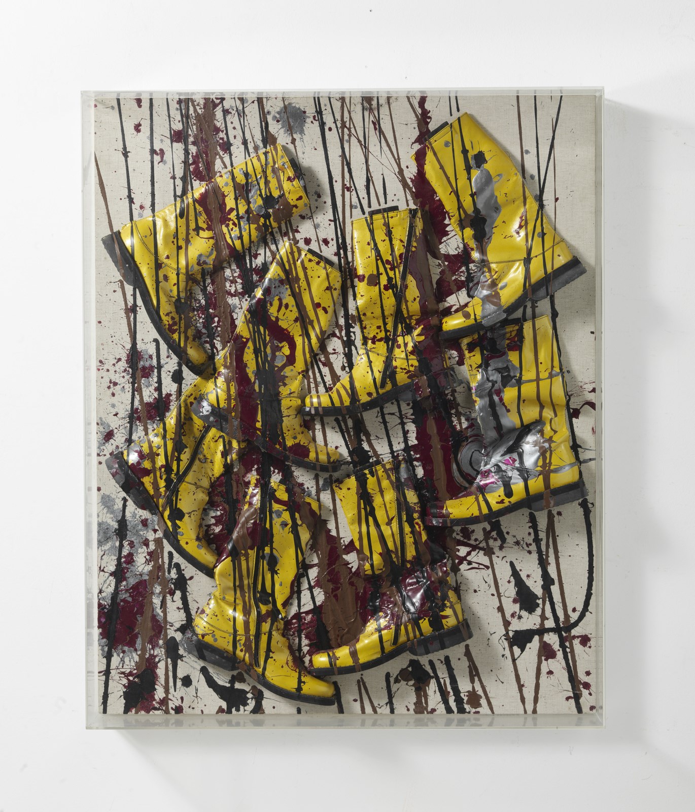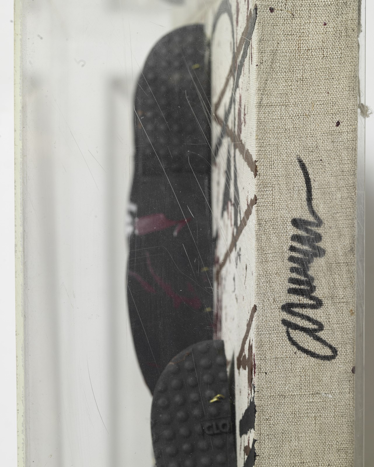 ARMAN FERNANDEZ (1928 - 2005) Senza titolo. 2004. Tecnica mista e applicazioni su tela. Cm 81,00 x 100,00. Firma sul margine superiore. Opera archiviata presso la Galleria Dante Vecchiato come da documentazione fotografica allegata all'opera riportante il relativo numero d'inventario e la firma dell'artista. La teca di plexiglass, entro la quale l'opera è inclusa, presenta alcuni difetti. Cornice presente