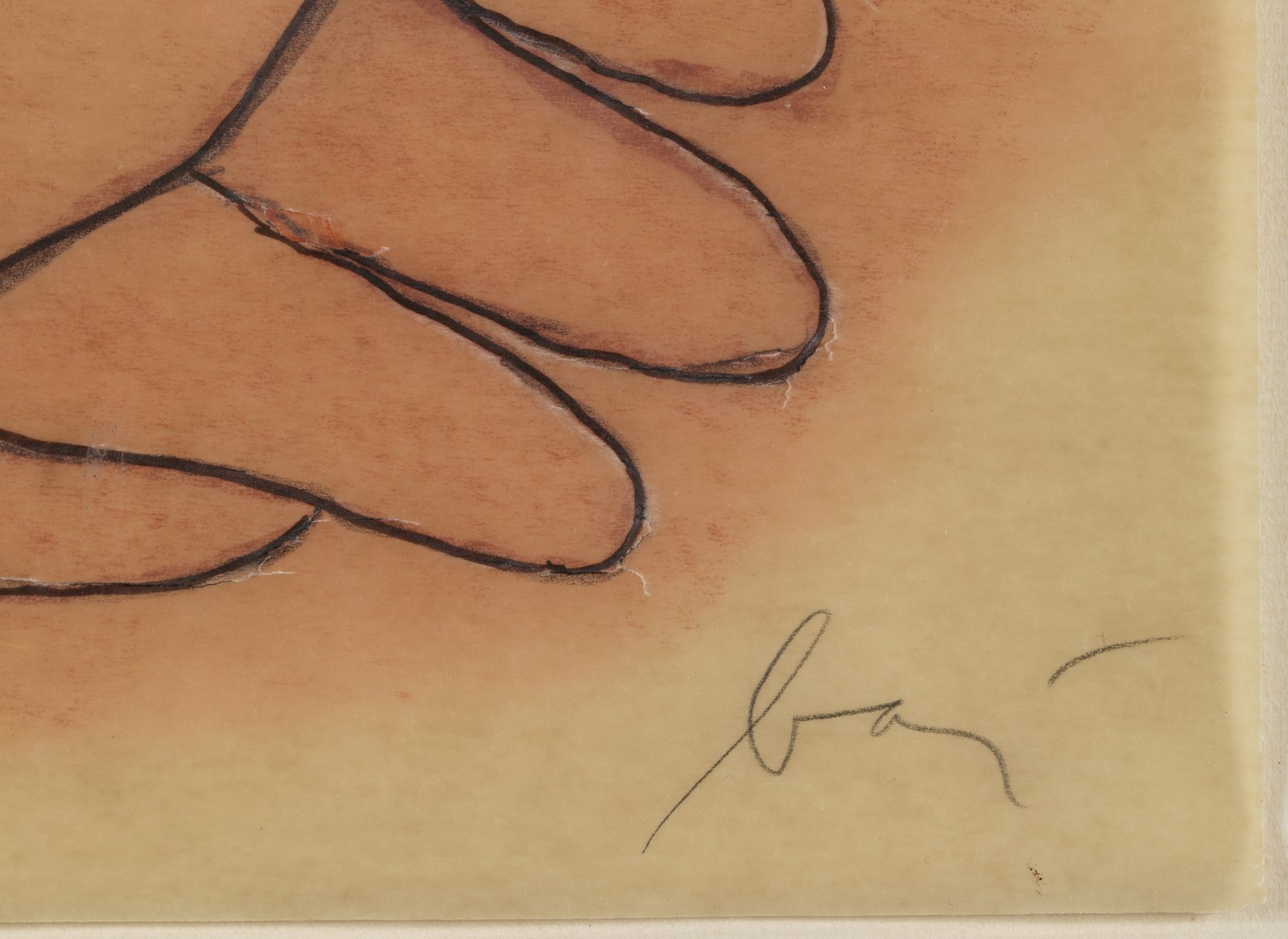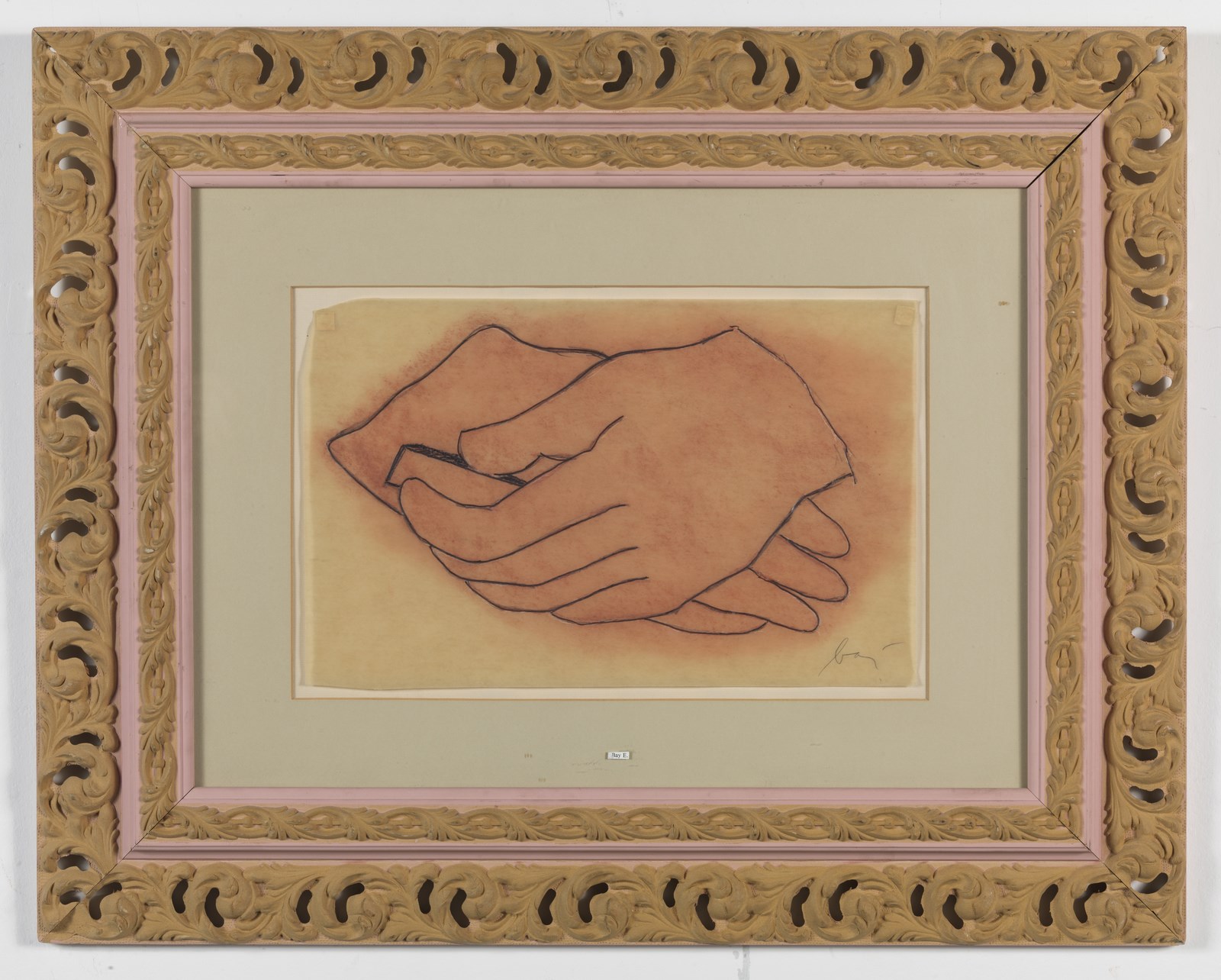 BAJ ENRICO (1924 - 2003) Studio per le mani di Milton,. 1971. Tecnica mista su carta. Cm 35,00 x 22,40. Firma in basso a destra. Autentica su fotografia di Roberta Cerini Baj. Si ringrazia la Sig.ra Roberta Cerini Baj per aver confermato l'autenticità dell'opera e dell'autentica. Difetti. Cornice presente