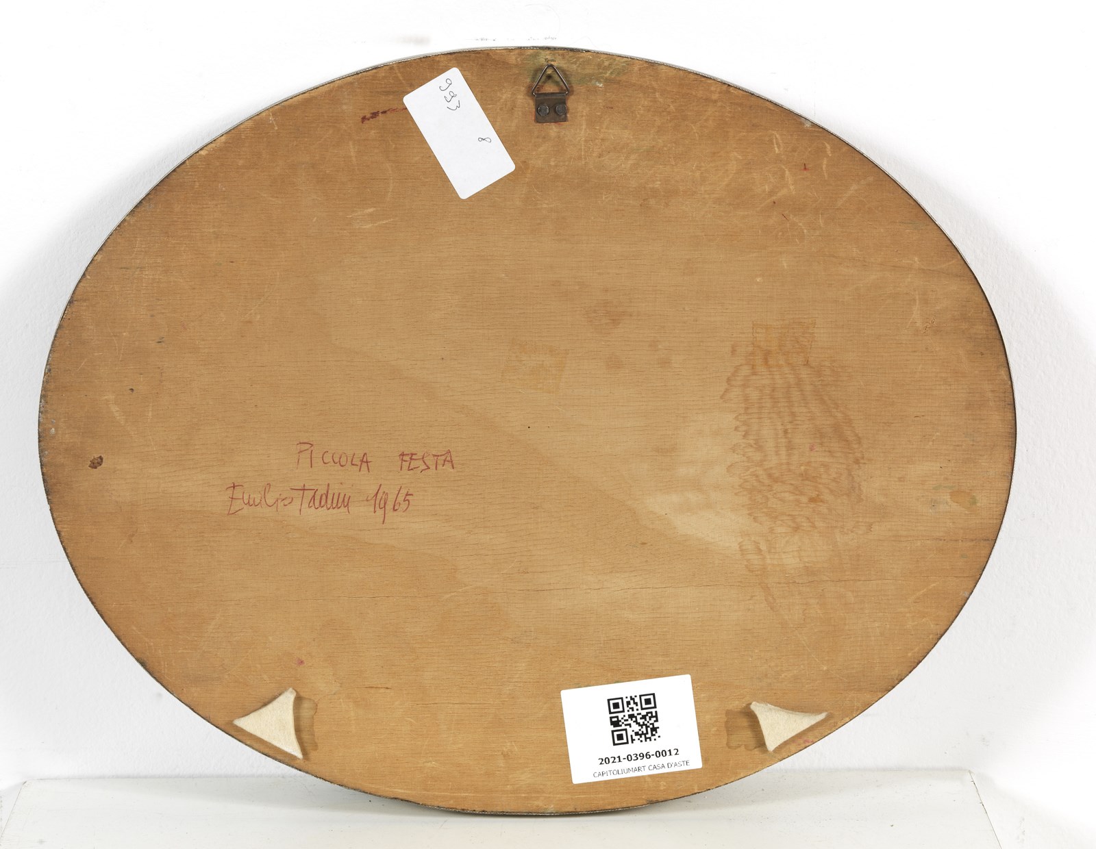 TADINI EMILIO (1927 - 2002) Piccola festa. 1965. Tecnica mista su tela su tavola. Cm 39,50 x 30,50. Firma e anno in basso a destra. Al retro titolo, firma e anno. Autentica su fotografia della Galleria Pace, Milano.