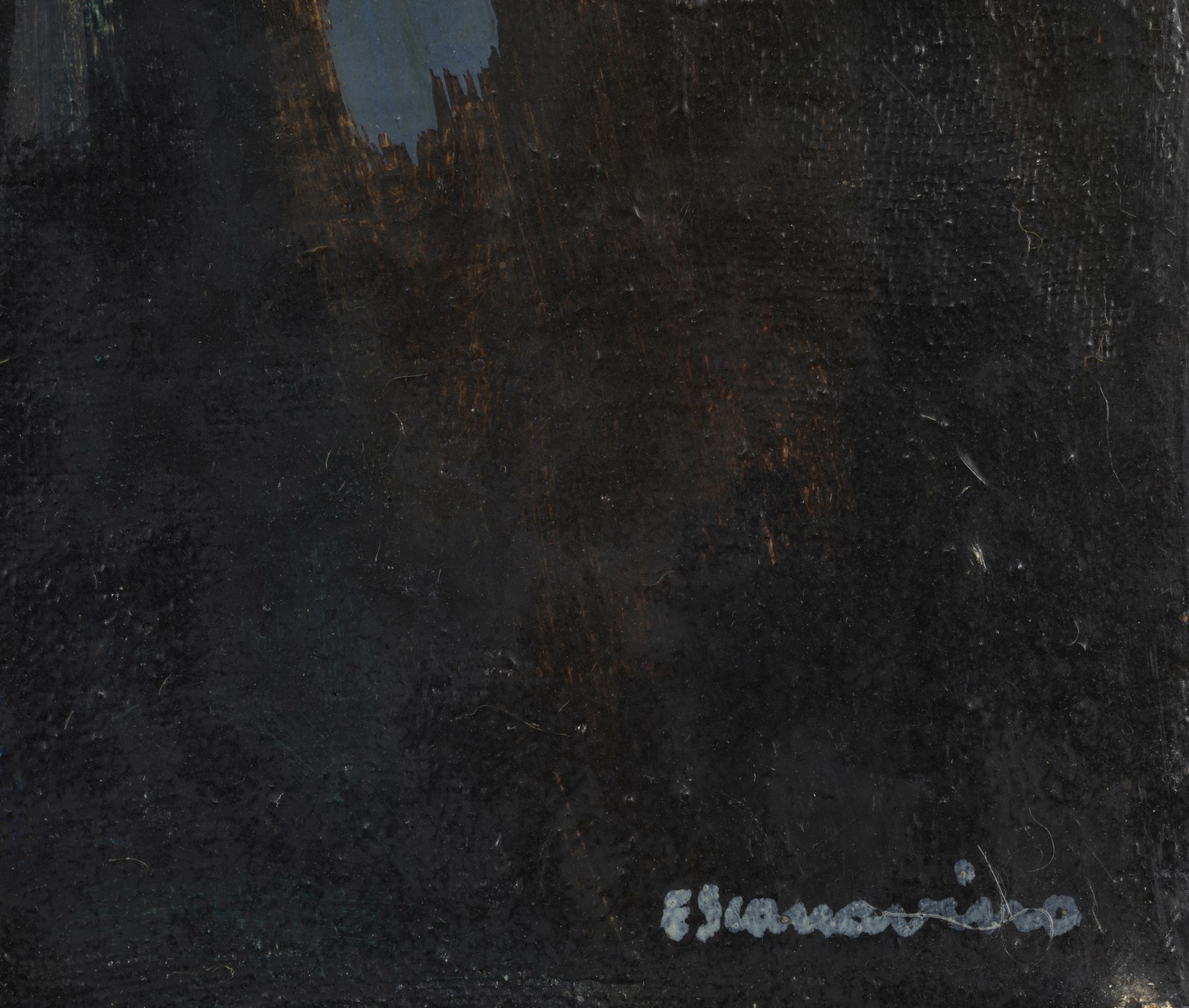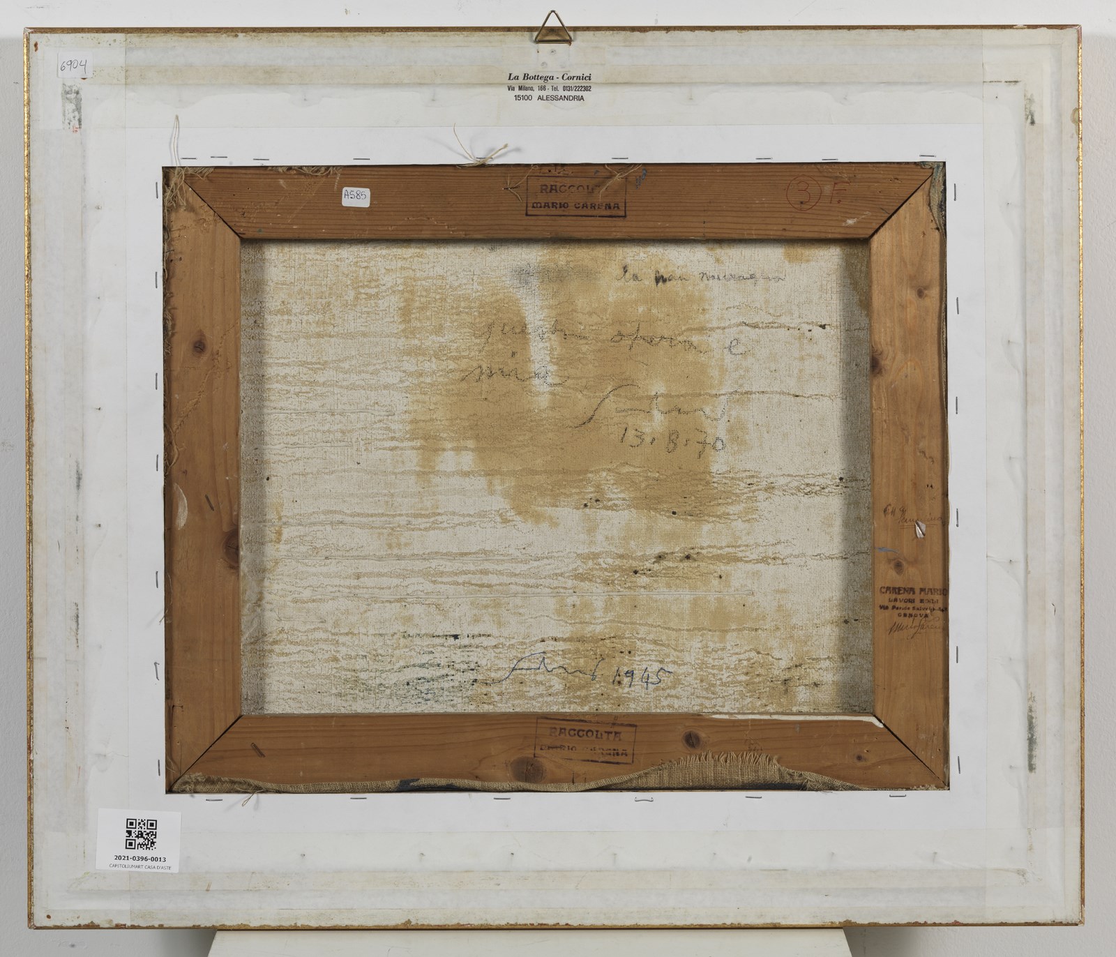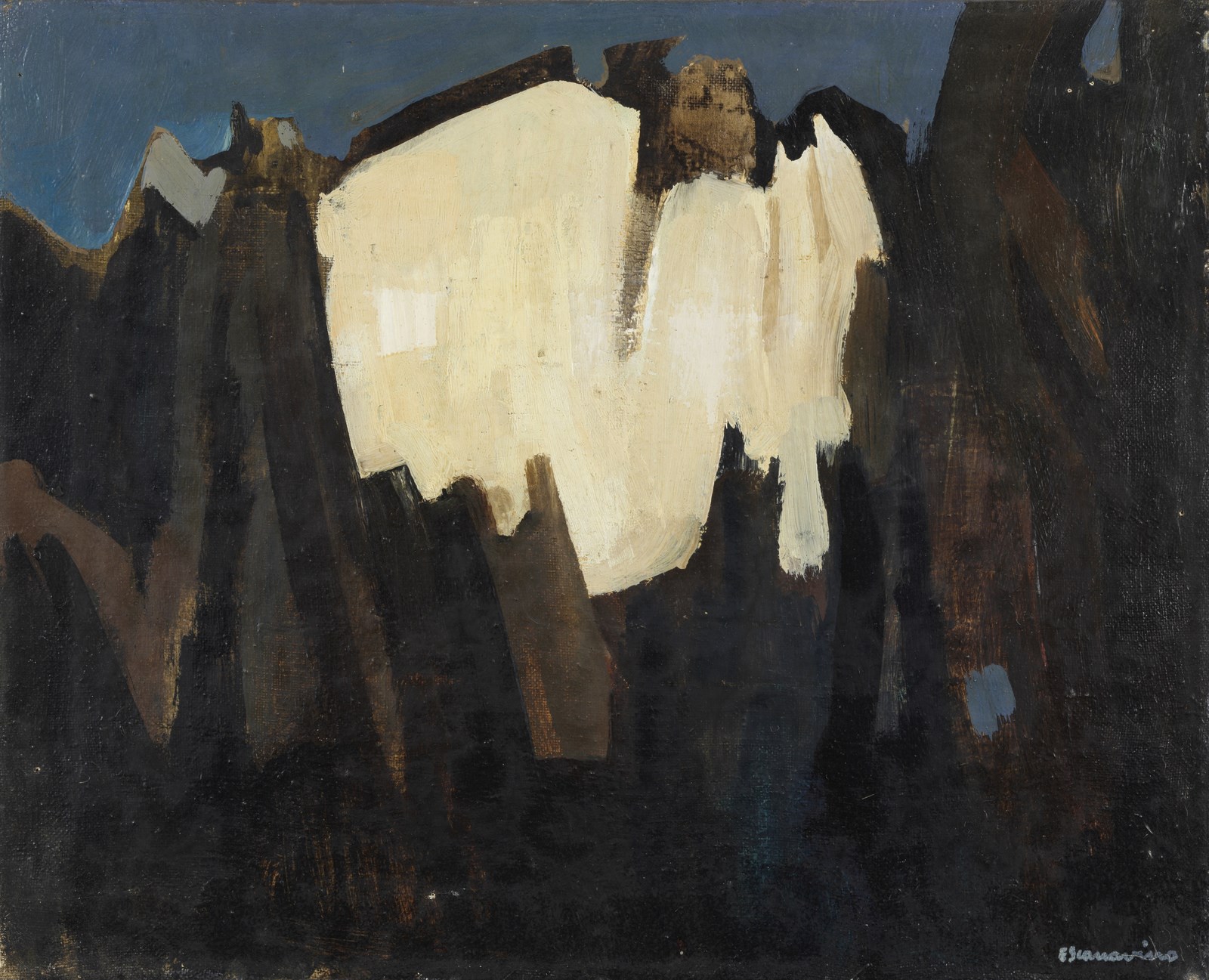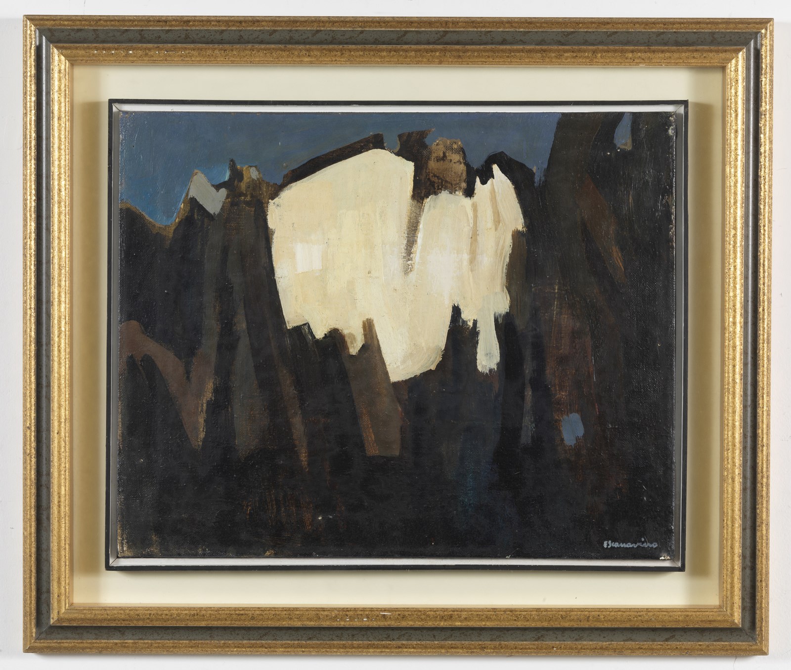 SCANAVINO EMILIO (1922 - 1986) La montagna. 1945. Olio su tela . Cm 49,50 x 40,00. Firma in basso a destra. Al retro firma, anno e firma per autentica datata 1970. Pubblicazione: Scanavino. Catalogo Generale a cura di Giorgina Graglia Scanavino e Carlo Pirovano, Electa, Milano, 2000, ill.2 -1945. Certificato di provenienza Bolli&Romiti Casa d'aste, Roma. Difetti. Cornice presente