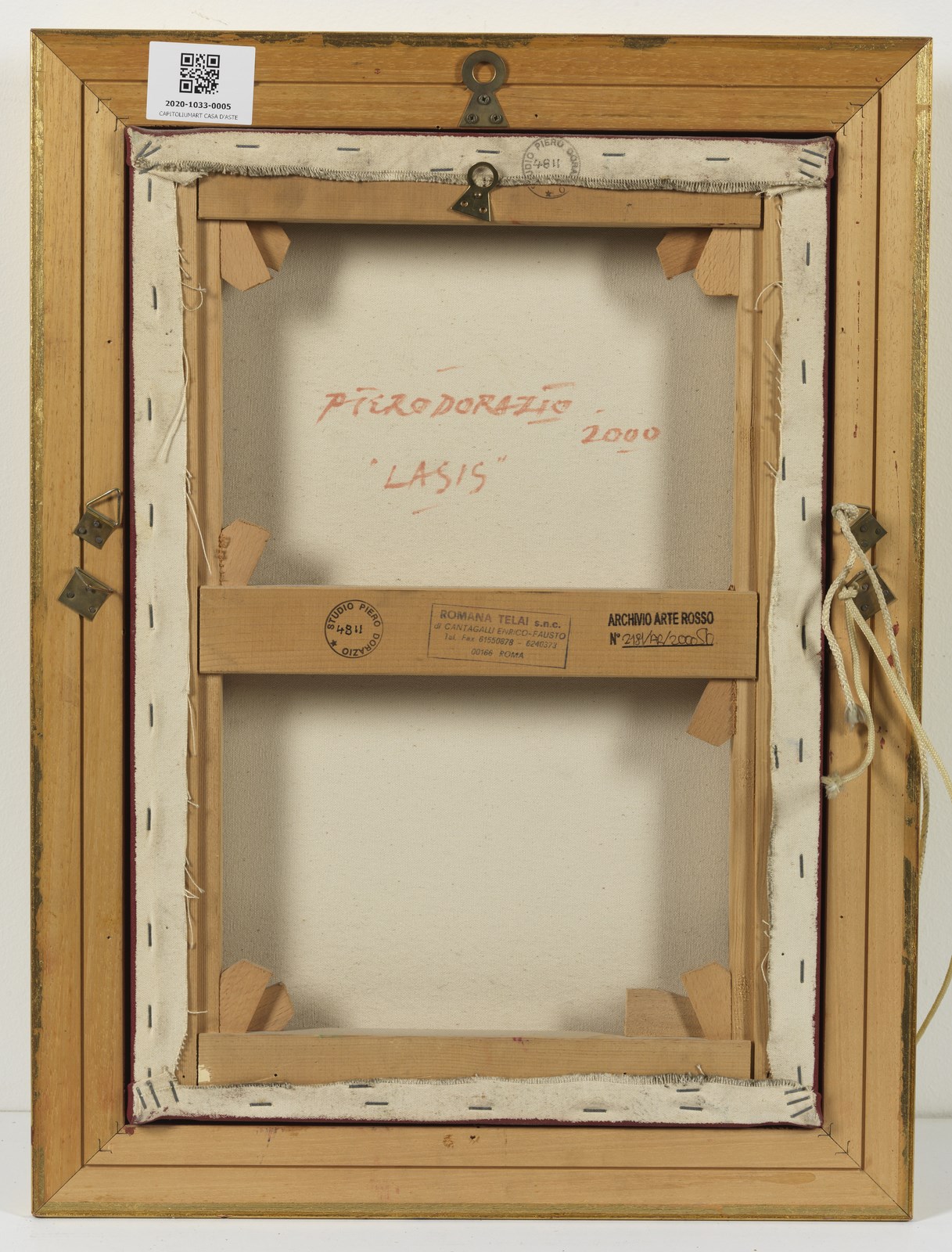 DORAZIO PIERO (1927 - 2005) Lasis. 2000. Olio su tela . Cm 35,00 x 50,00. Al retro titolo, firma, anno, timbro Studio Dorazio e Archivio Arterosso. Autentica dell'artista su fotografia. Autentica della Galleria ArteRosso, Roma, come da documentazione fotografica allegata all' opera riportante il relativo numero d'inventario. Opera archiviata presso l'Archivio Piero Dorazio, Milano, come da documentazione fotografica allegata all'opera riportante il relativo numero d'inventario. Cornice presente