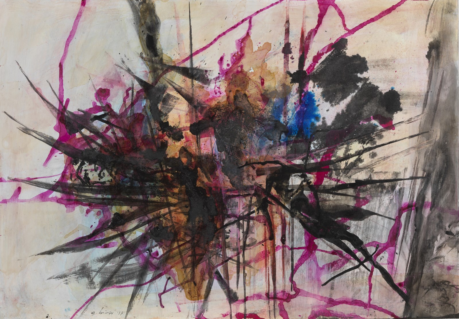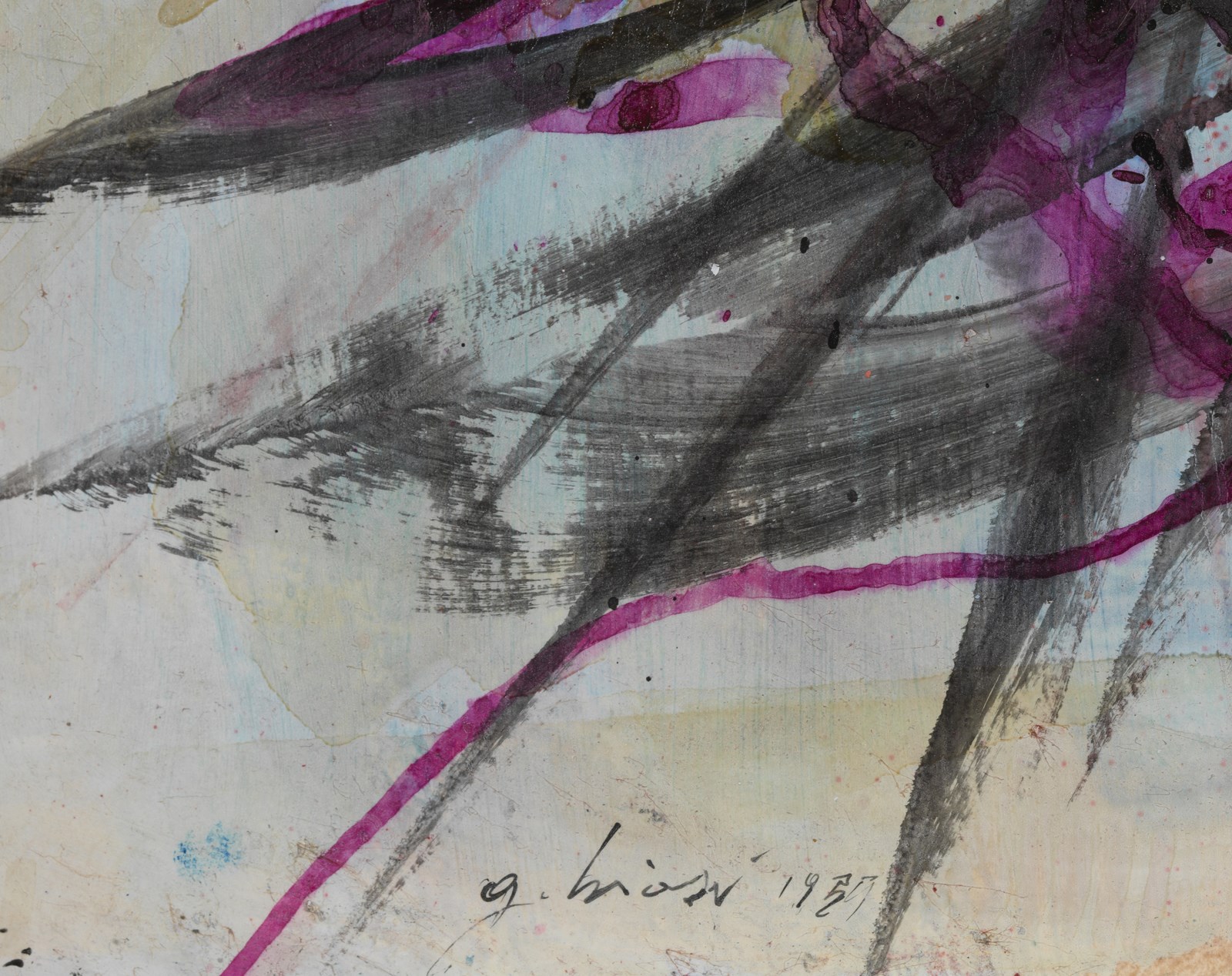 BIASI GUIDO (1933 - 1982) Foresta nucleare. 1955. Tecnica mista su carta. Cm 60,00 x 40,00. Doppio disegno. Titolo, firma e anno in basso a destra; titolo e anno in basso a sinistra. Provenienza: Collezione privata, Roma.