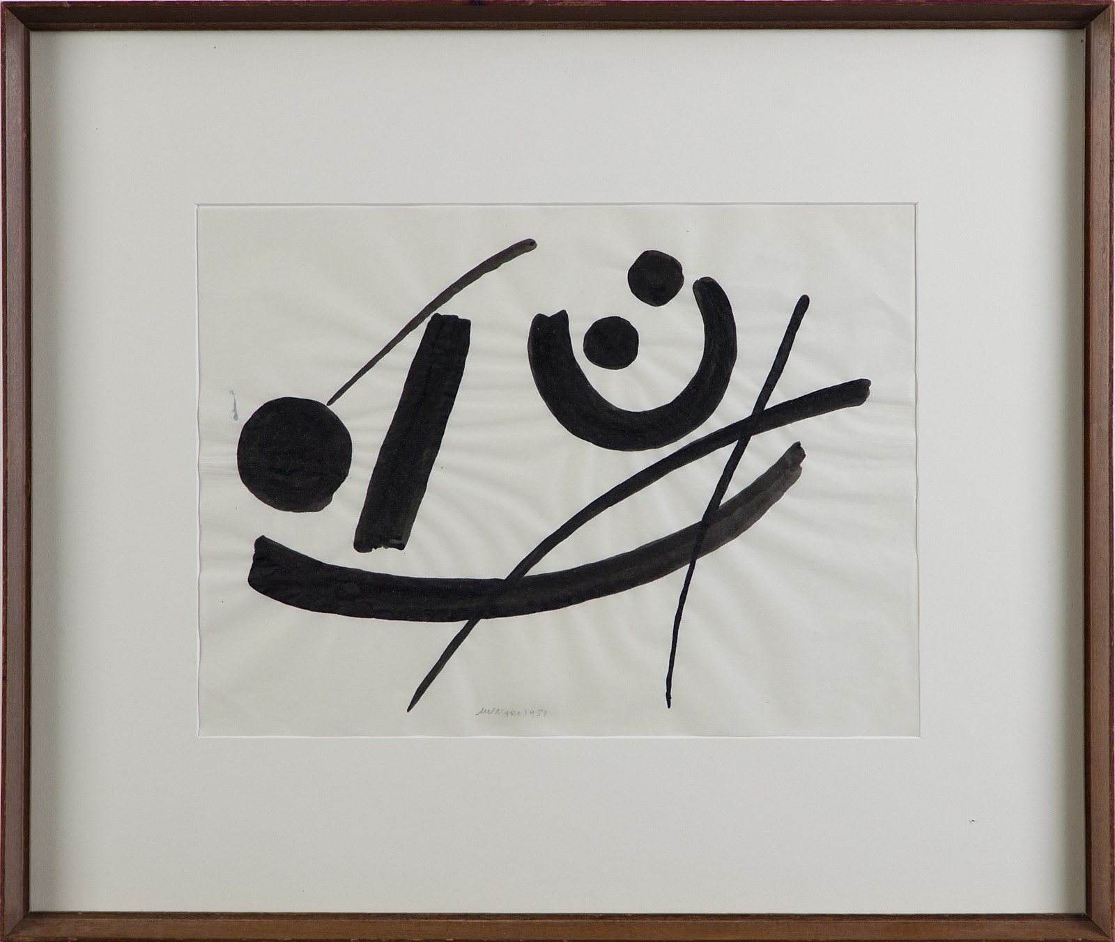 MUNARI BRUNO (1907 - 1998) Simultaneità degli opposti. 1951. China su carta. Cm 30,00 x 22,00. Firma e anno in basso al centro. Autentica su fotografia di Alberto Munari. Cornice presente
