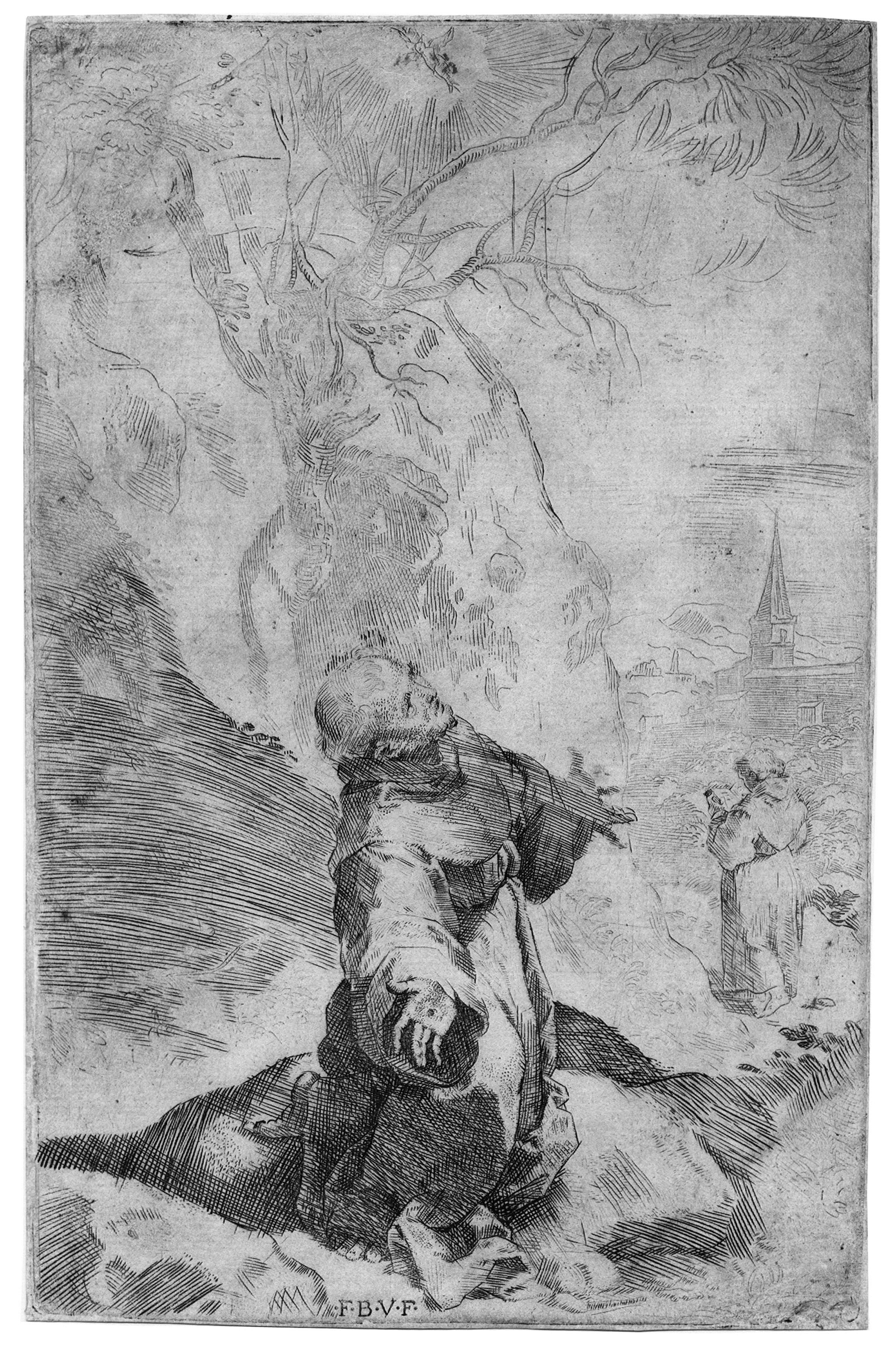 Monogrammata sulla lastra in basso al centro. Il riferimento del soggetto, di sicura attribuzione al Barocci, è discusso. Bartsch e Gandellini citano il dipinto per la Chiesa dei Cappuccini di Urbino, Schmarsow ritiene invece che si tratti di un soggetto originale per l’incisione; Krommes fa riferimento ad un dipinto incompiuto del 1570 nei depositi della Galleria Nazionale di Urbino. Stato unico.