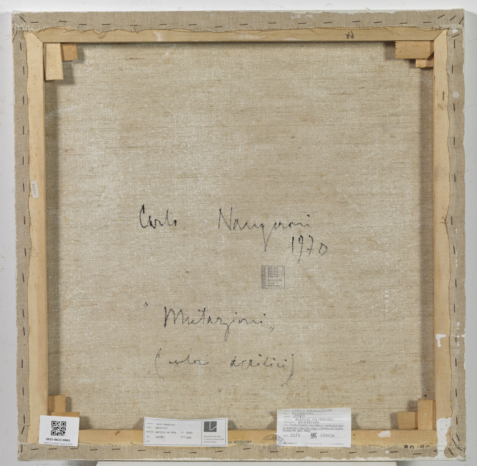 NANGERONI CARLO (n. 1922) Mutazioni. 1970. Acrilico su tela. Cm 60,00 x 60,00. Al retro titolo, firma, anno, cartiglio descrittivo e timbro Lorenzelli arte, Milano e cartiglio descrittivo ABC Arte, Genova. Cerificato di autenticità ABC Arte, Genova. Esposizione: Carlo Nangeroni. Il dominio della luce a cura di Ivan Qauroni, 26 Ottobre 2018 -5 Gennaio 2018, ABC Arte, Genova. Pubblicazione: Carlo Nangeroni. Il dominio della Luce a cura di Ivan Quaroni, ABC Arte, Genova, p.62. Provenienza: ABC Arte, Genova; Collezione privata, Napoli.