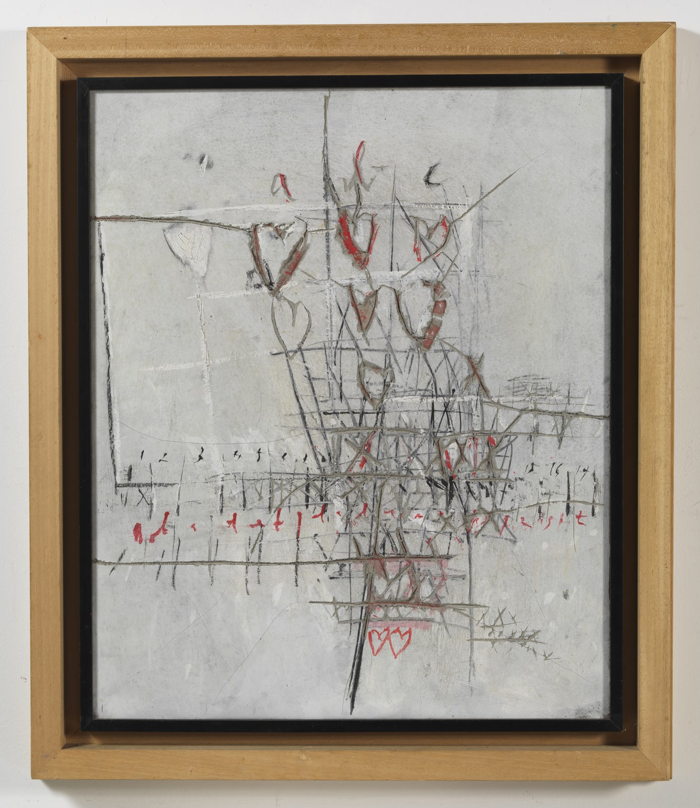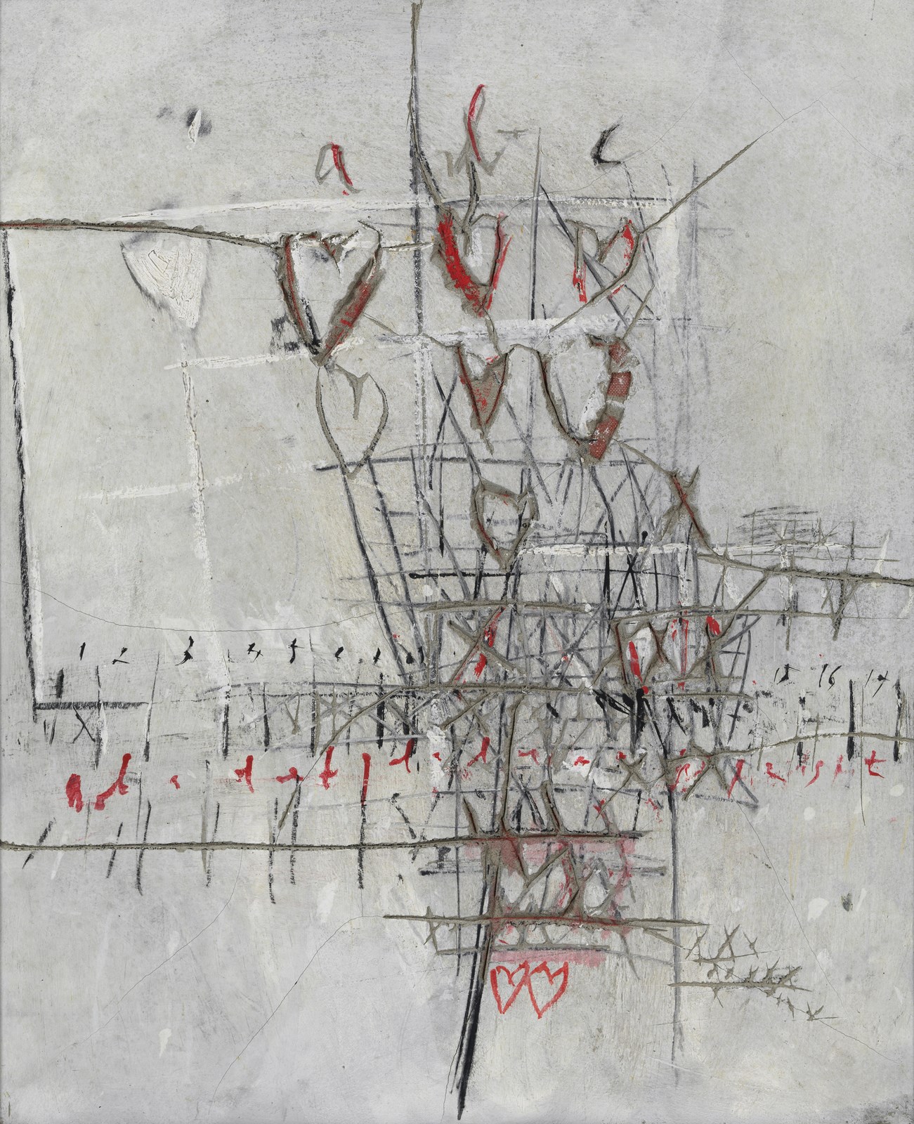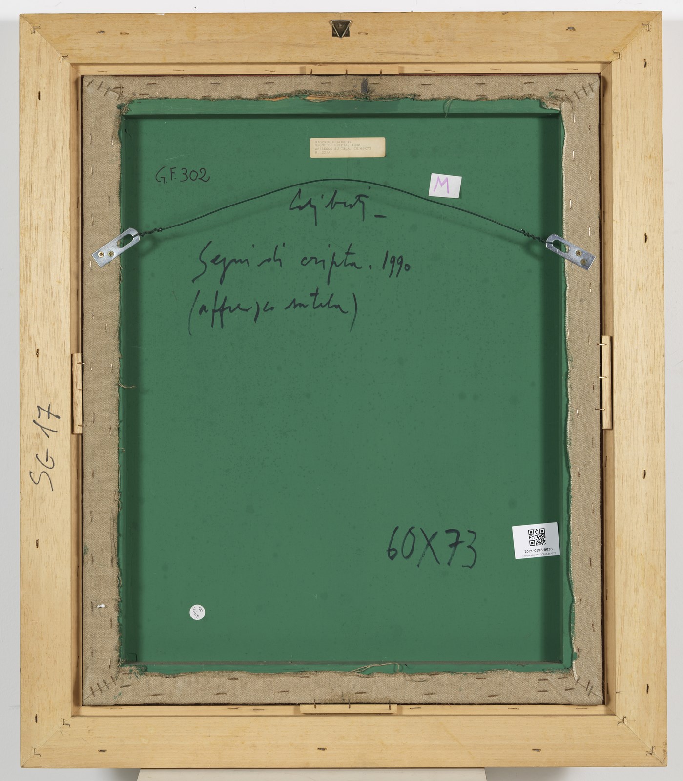 CELIBERTI GIORGIO (n. 1929) Segni di cripta. 1990. Affresco su tela. Cm 60,00 x 73,00. Al retro titolo, firma e anno. Autentica dell'artista su fotografia riportante il relativo numero d'inventario. Certificato di provenienza Telemarket, Roncadelle. Cornice presente
