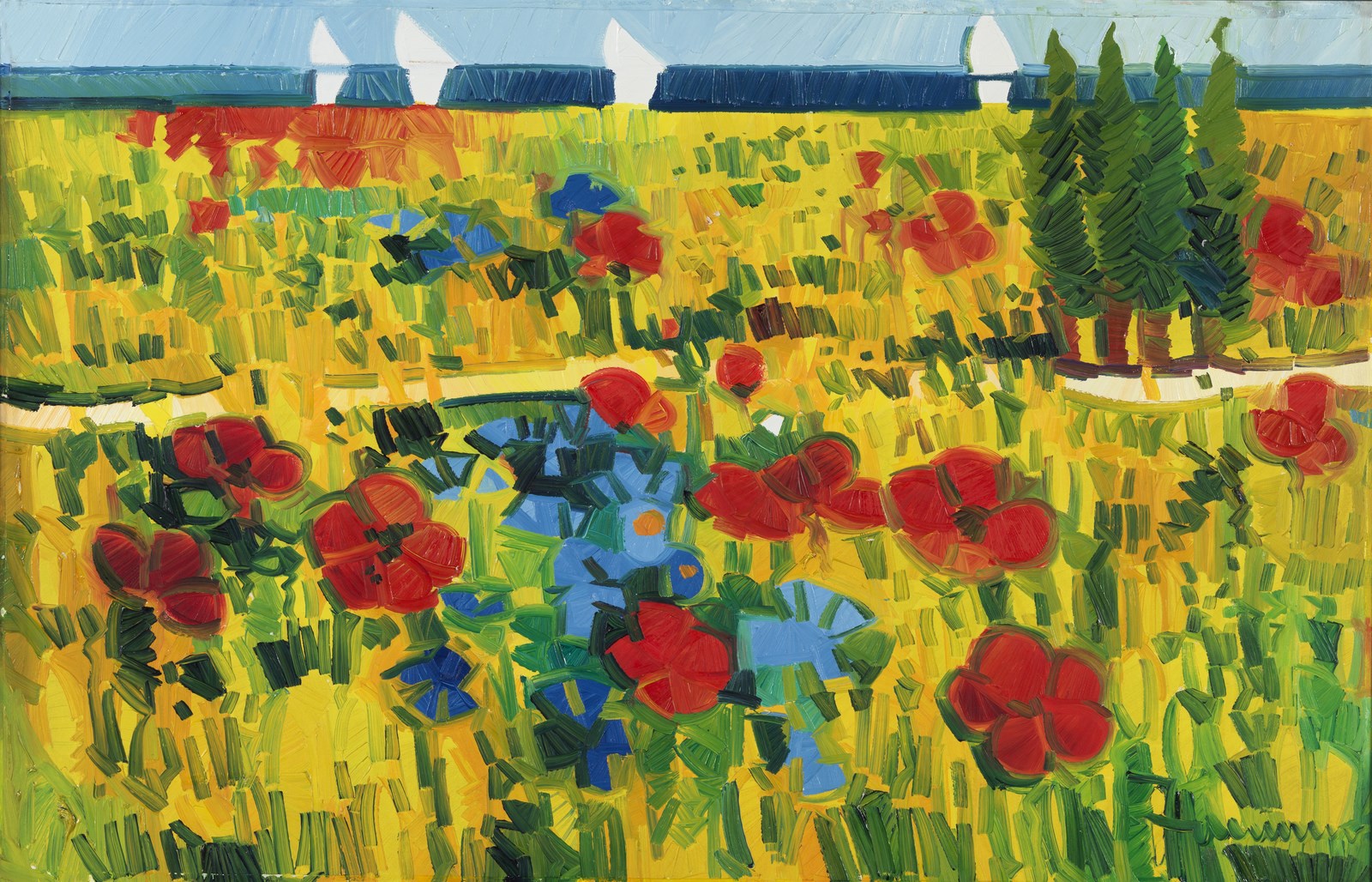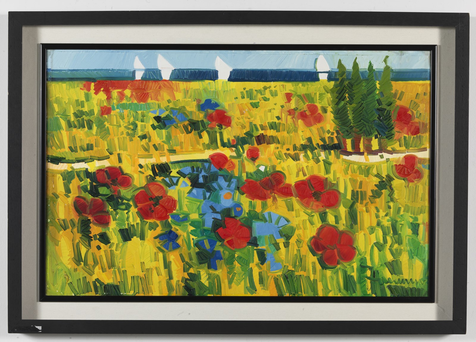 FACCINCANI ATHOS (n. 1951) Tra papaveri e fiordalisi. 1995. Olio su tela . Cm 85,00 x 55,00. Firma in basso a destra. Opera archiviata presso l'Archivio fotografico generale delle opere di Athos Faccincani - Ardea, Brescia, come da documentazione fotografica allegata all'opera riportante il relativo numero d'inventario e la firma dell'artista. Certificato di garanzia Meeting Art, Vercelli. Cornice presente