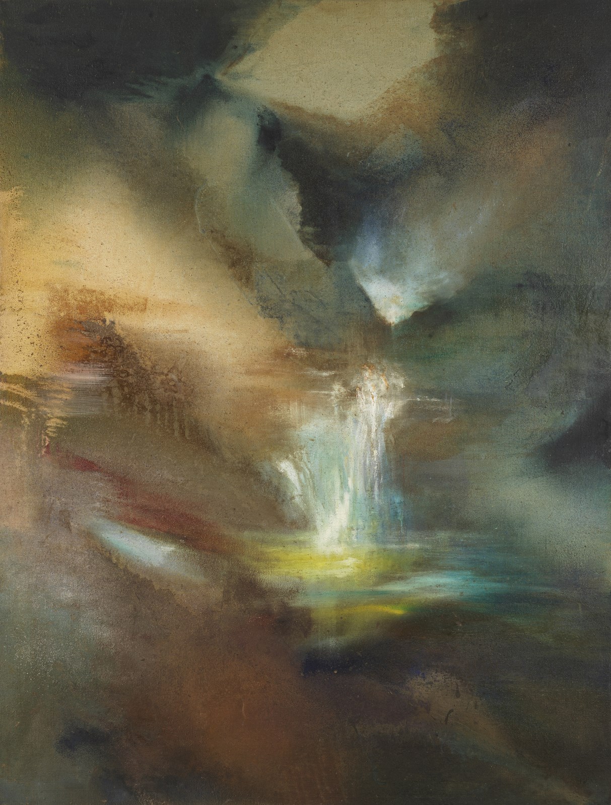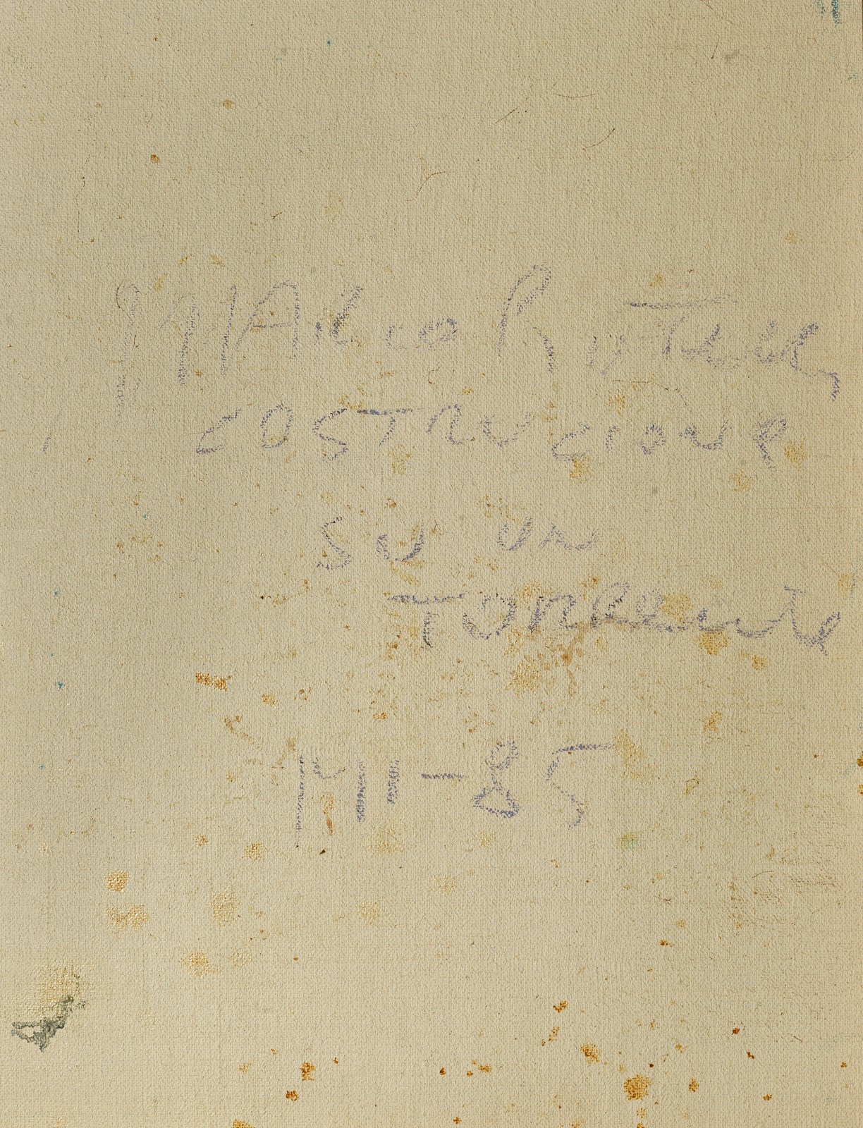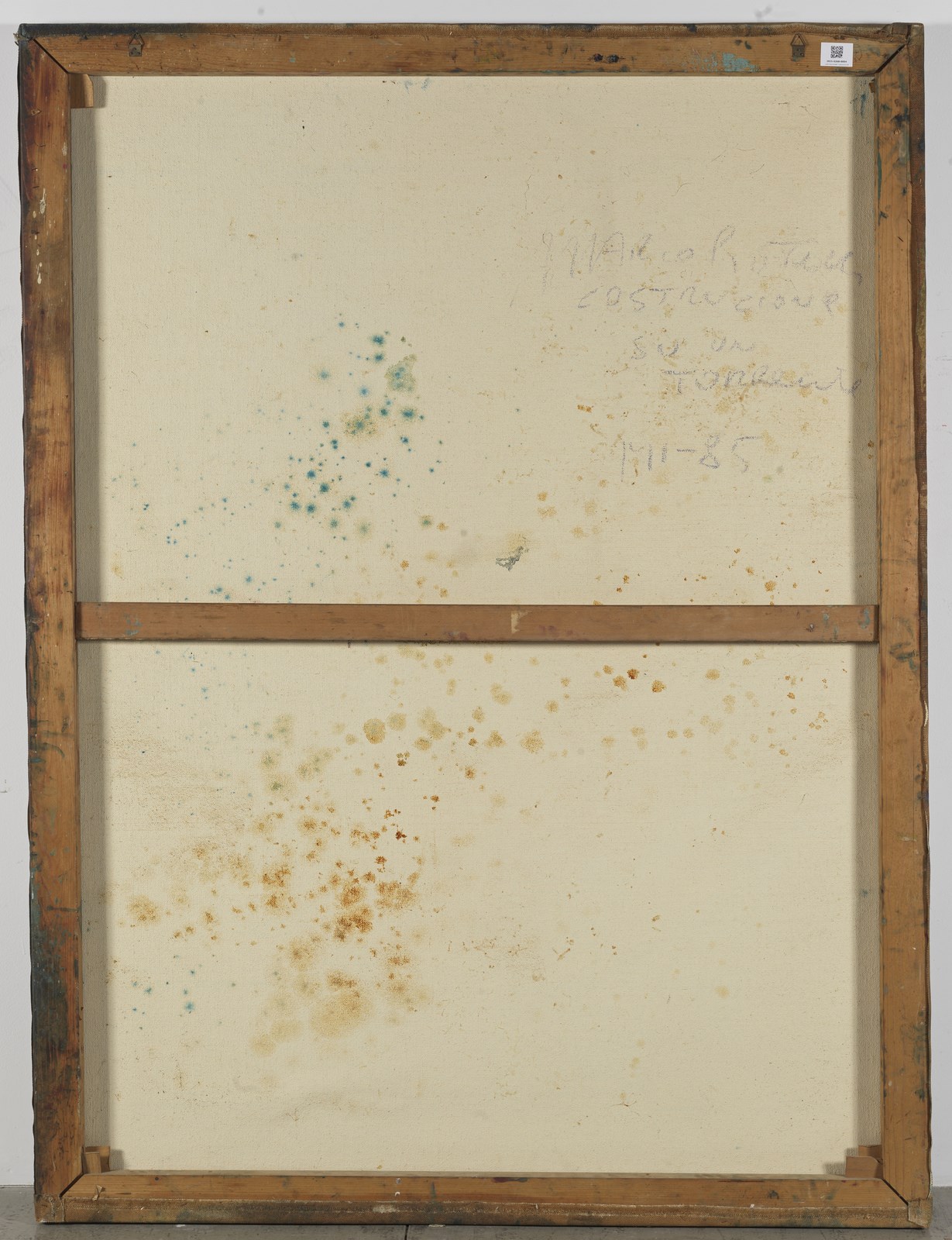 ROTELLI MARCO NEREO (n. 1955) Costruzione su un torrente. 1985. Tecnica mista su tela. Cm 150,00 x 200,00. Al retro titolo, firma e anno. Lievi difetti.