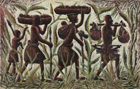 KIBWANGA MWENZE (1925 - 1999) Senza titolo. Olio su tela applicata su tavola. Cm 99,50 x 64,00. Firma in basso a destra.