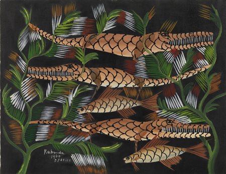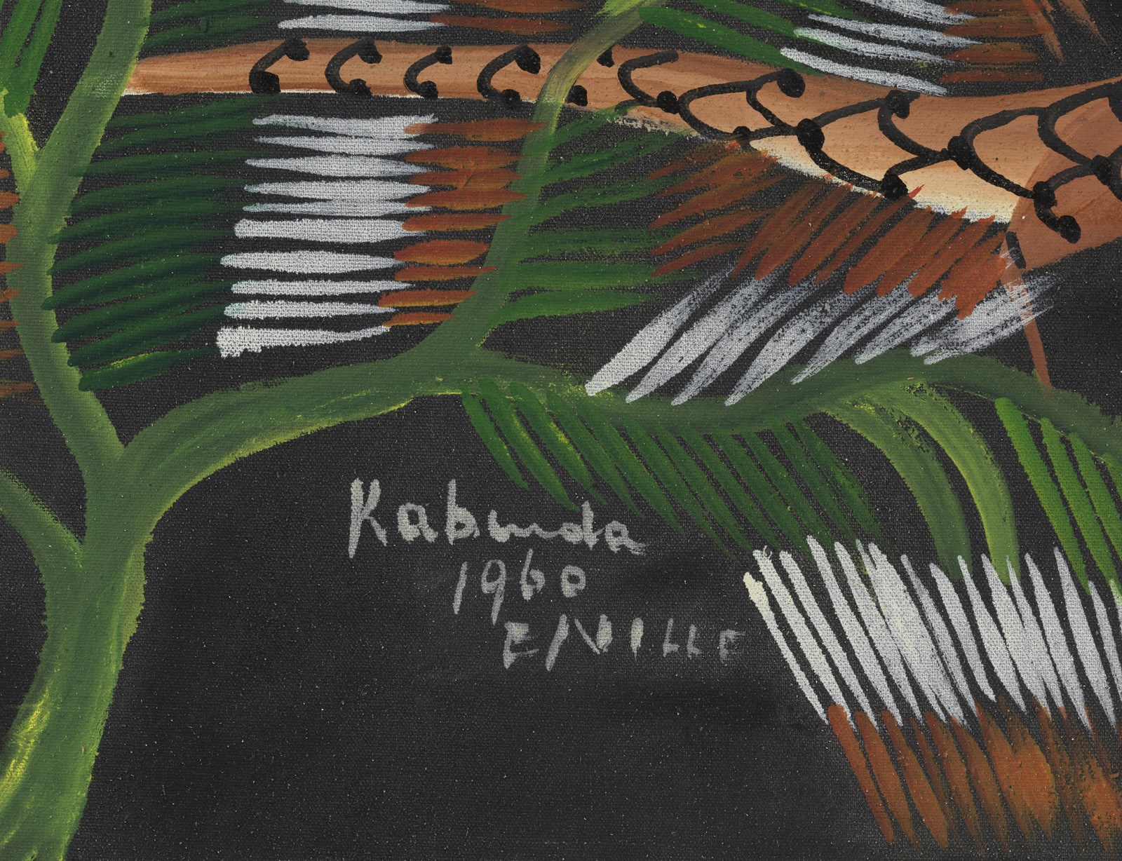 VICTOR KUNKULU KABINDA (n. 1927) Senza titolo. 1960. Olio su tela applicata su tavola. Cm 75,00 x 59,00. Firma e anno in basso a sinistra. Lievi difetti.