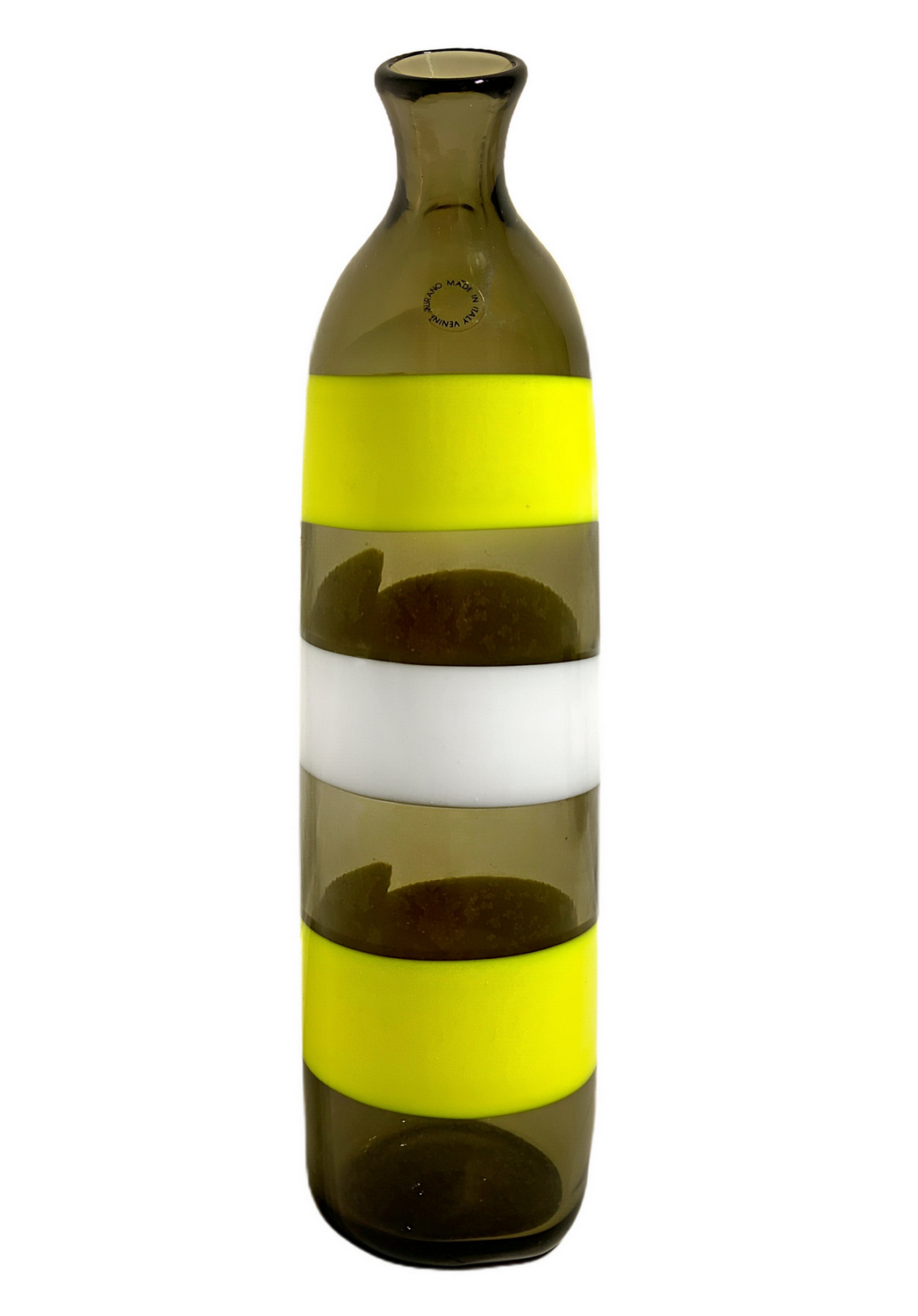 Venini, disegno di Fulvio Bianconi, bottiglia. anno 1983/1987. Colore talpa a fasce applicate in pasta vitrea nei toni del giallo e bianco. H 35,5