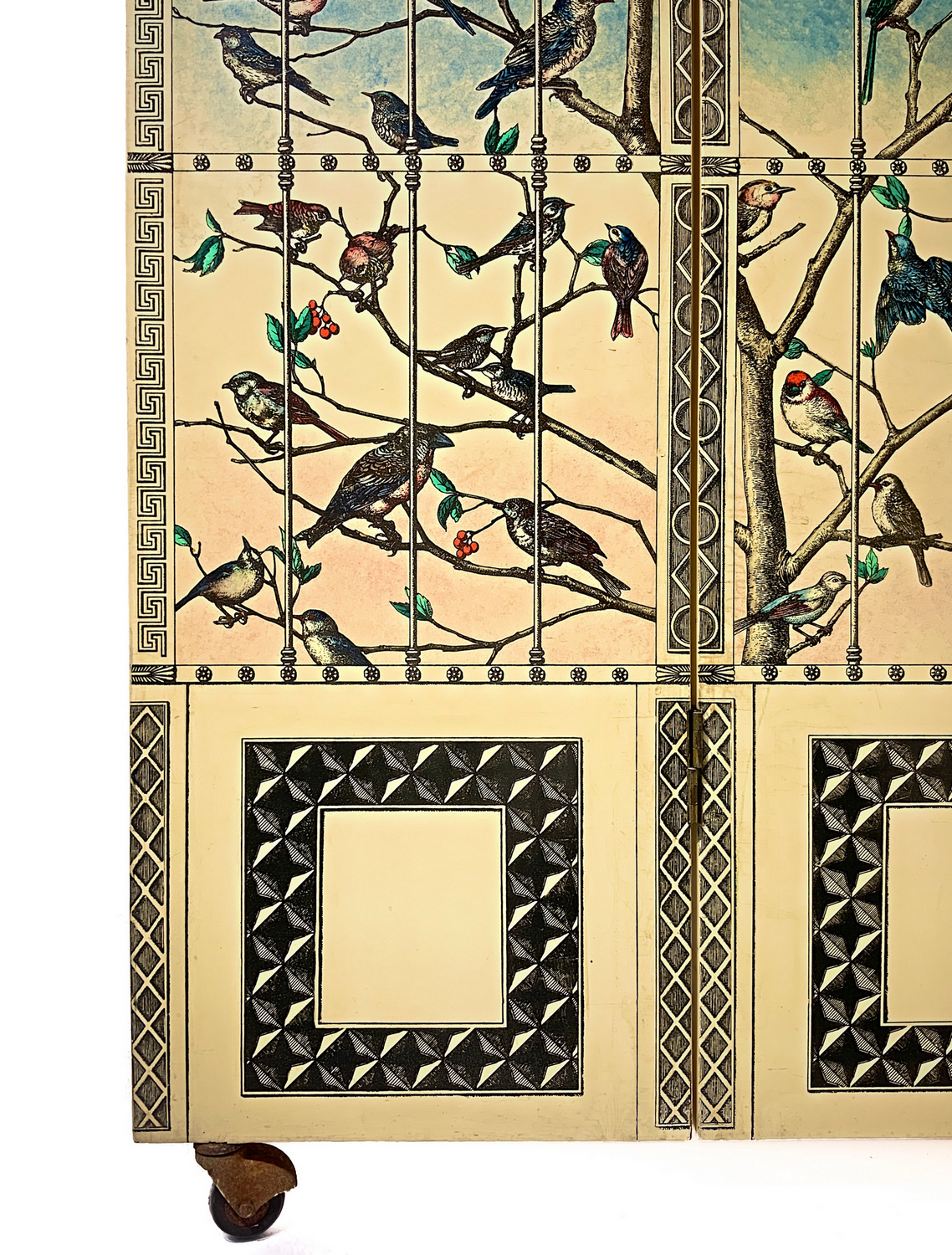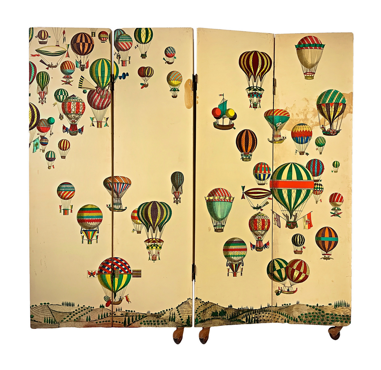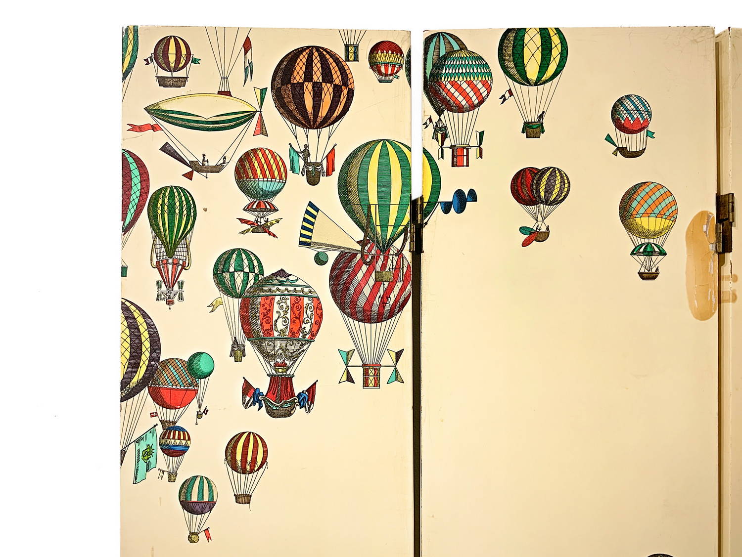 Fornasetti, Eccezionale paravento pieghevole su ruote. Anni 50, di Pietro Fornasetti, Italia,Struttura in legno laccato e decoro serigrafato, fantasia palloni su un verso e uccelli sull'altro. Pezzo da collezione. Presenta macchie e segni d'uso, mancanza di rotelle.