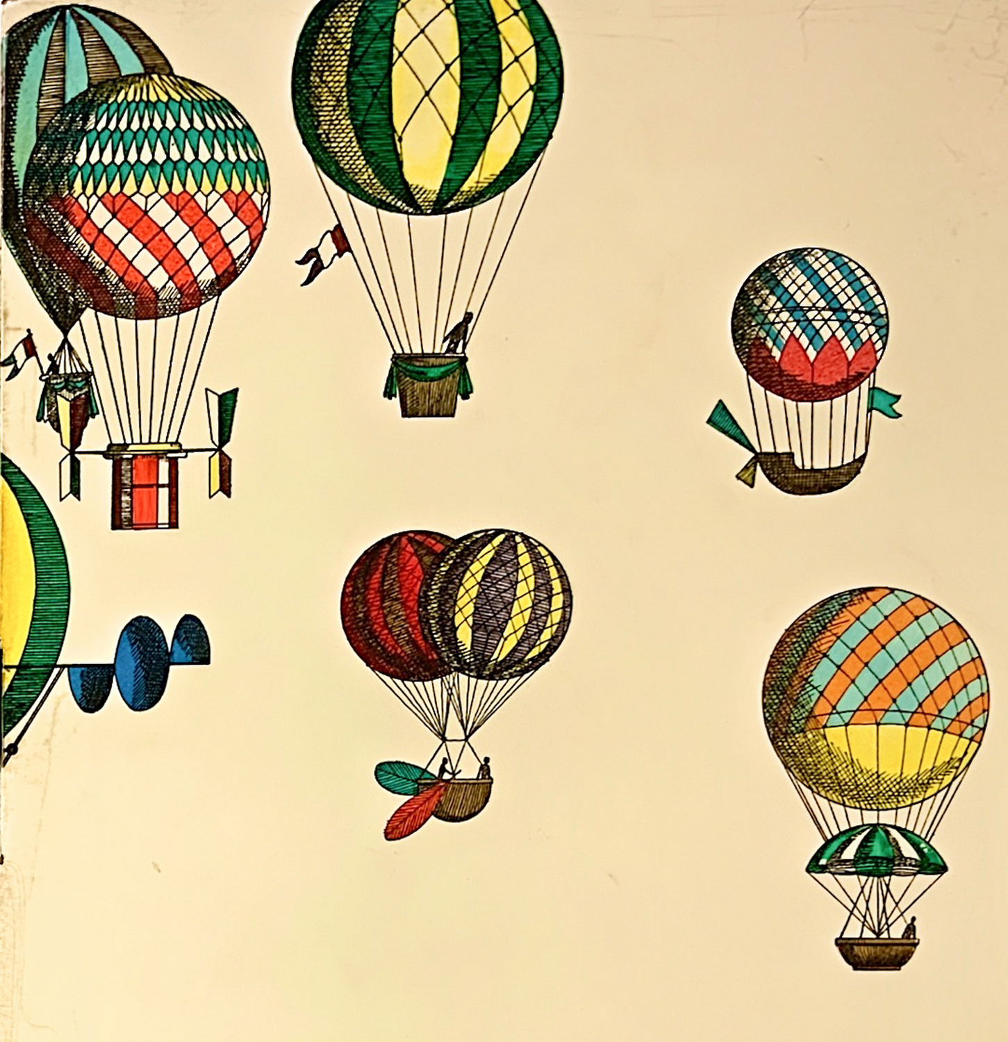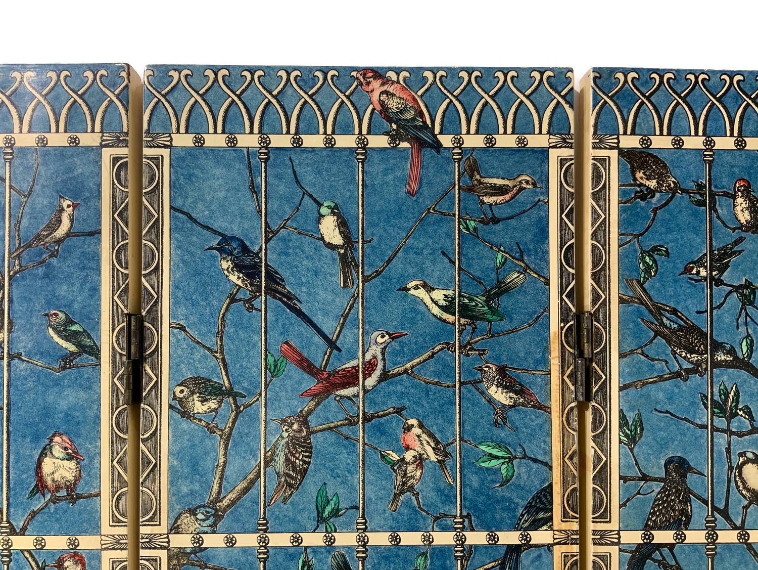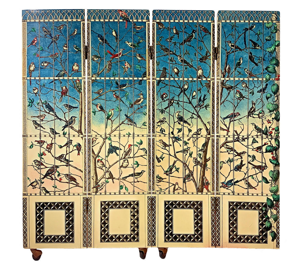 Fornasetti, Eccezionale paravento pieghevole su ruote. Anni 50, di Pietro Fornasetti, Italia,Struttura in legno laccato e decoro serigrafato, fantasia palloni su un verso e uccelli sull'altro. Pezzo da collezione. Presenta macchie e segni d'uso, mancanza di rotelle.