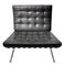 Poltrona stile Barcelona. Anni '90,struttura in metallo cromato, spalliera e seduta in pelle nei toni del nero, lavorazione capitonnè. Stringhe di supporto in cuoio H cm 74, cm 75x90