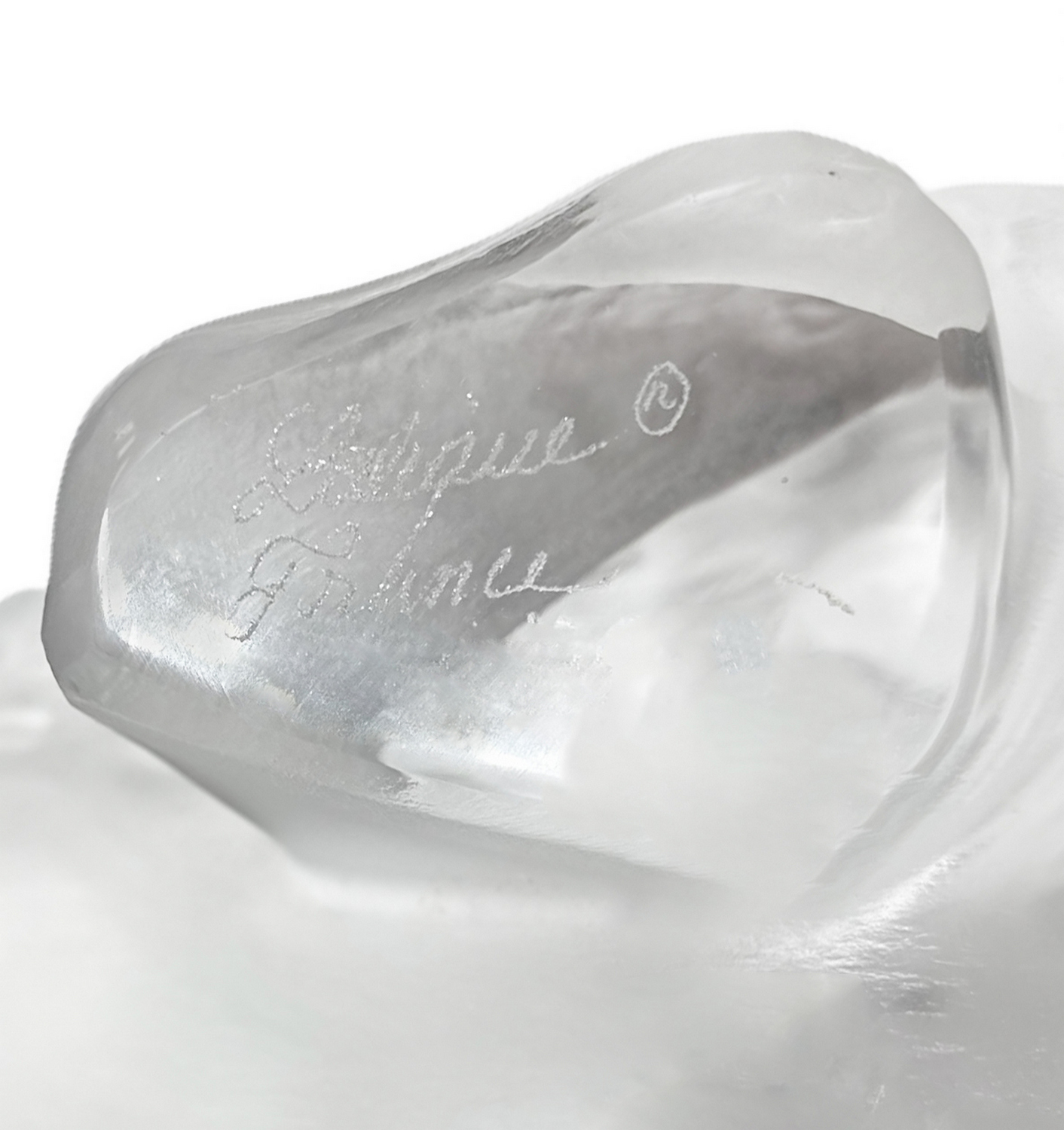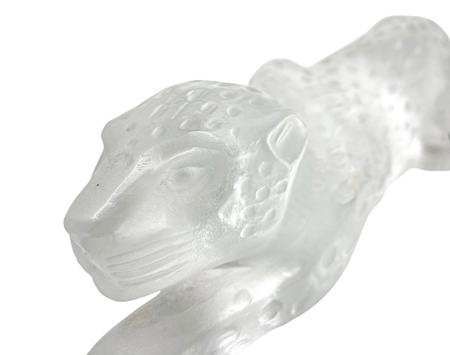 Lalique, scultura in vetro trasparente raffigurante pantera, con superficie acidata, anni '80. Firma incisa.