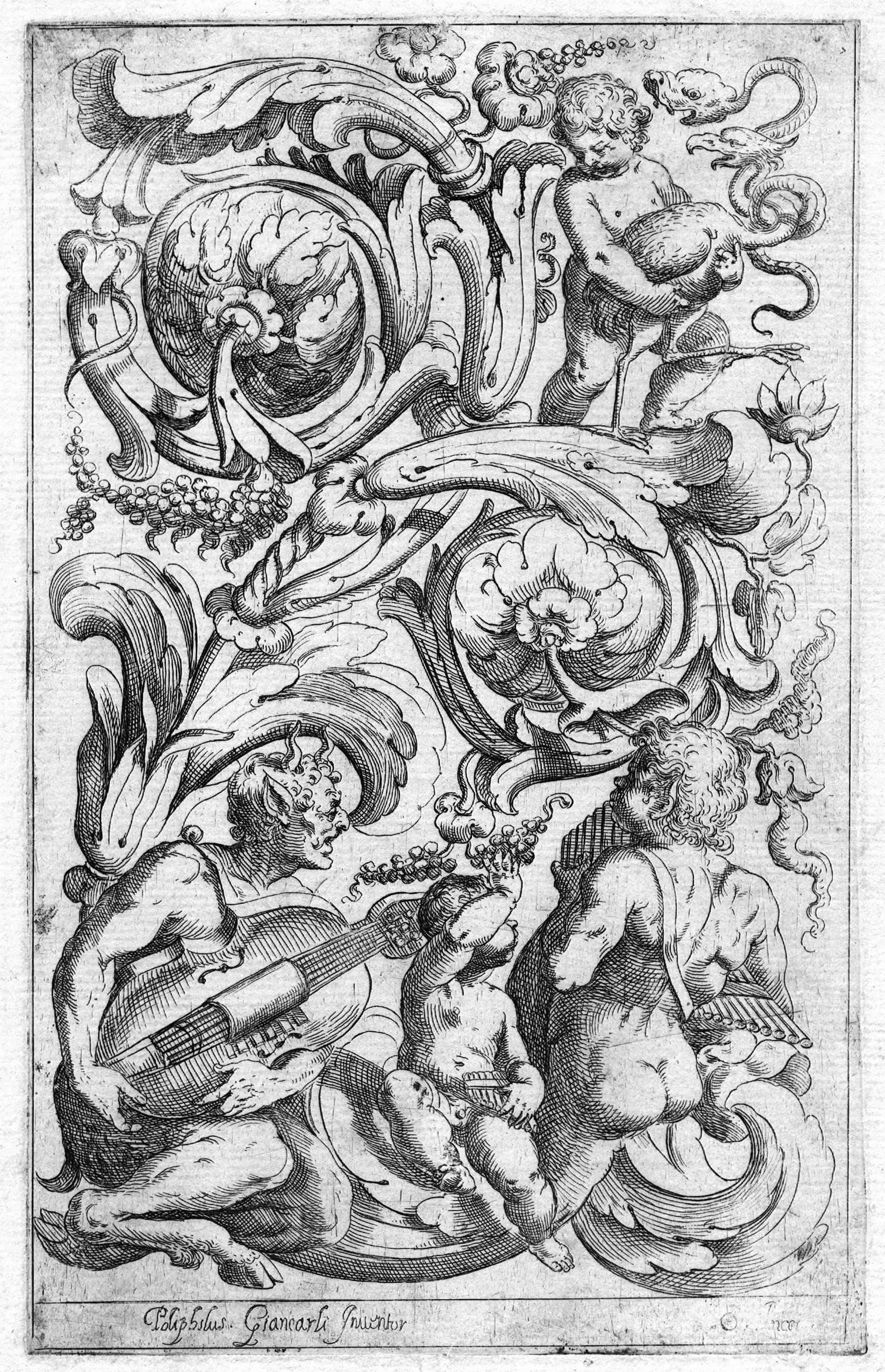 Firmata sulla lastra in basso a sinistra. Da Disegni varii di Polifilo Zancarli, serie non datata di 10 grottesche verticali. Stato unico.