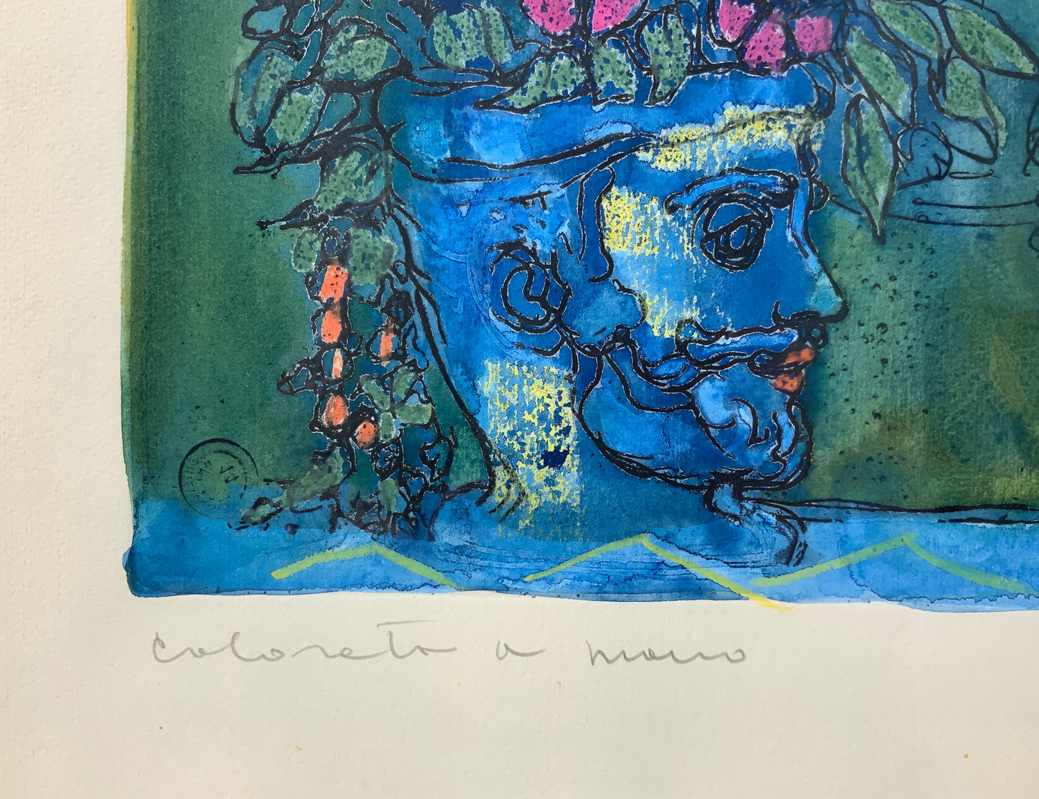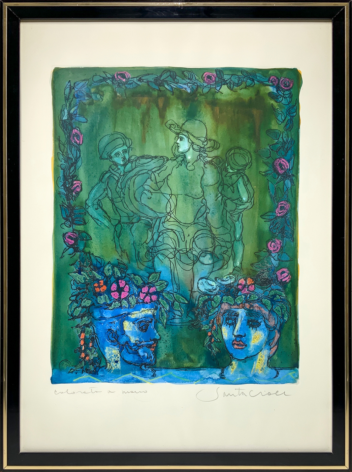 Litografia su carta colorata a mano raffigurante personaggi. Antonio Santacroce (Rosolini 1945). Firmata in basso a destra Santa Croce