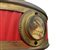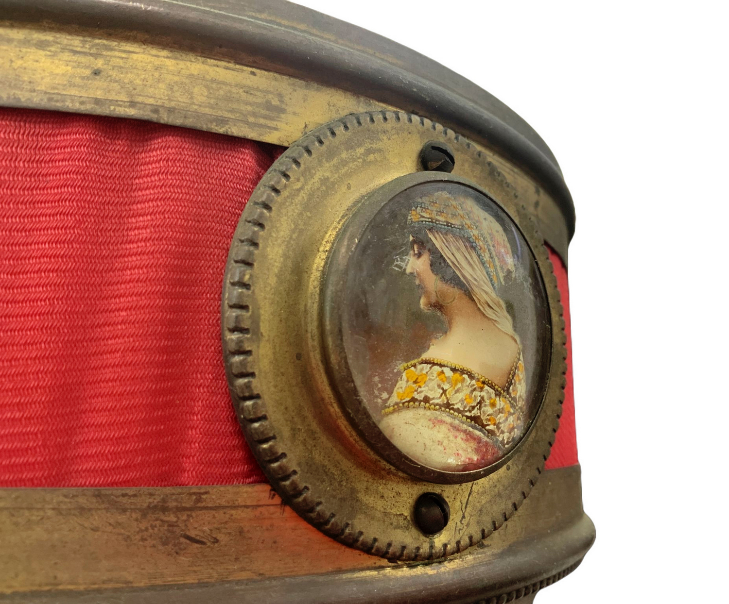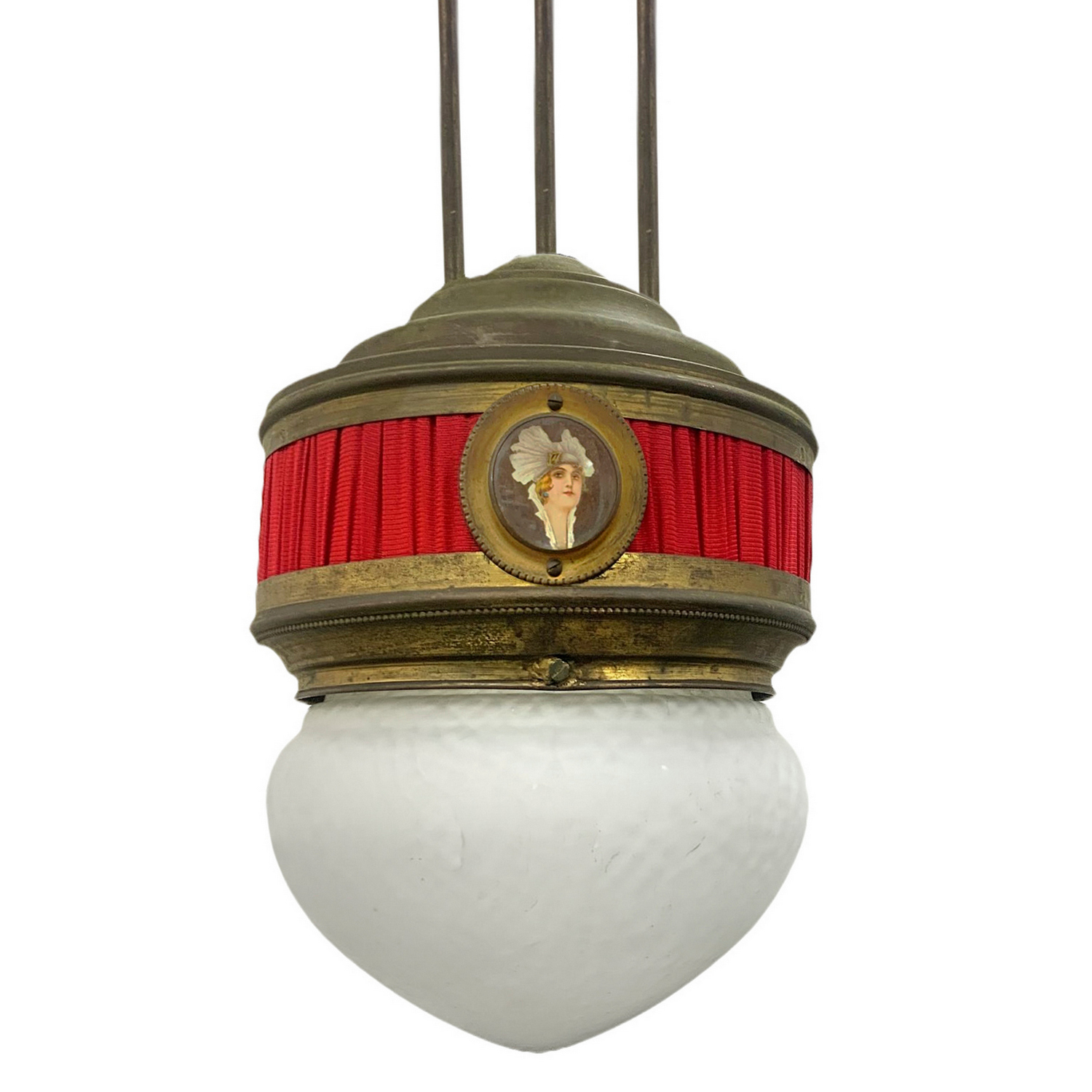 Lampadario liberty, fine XIX/inizi XX secolo. Fine XIX/inizi XX secolo,In ottone dorato con fascia plissettata di cotone recante n. 3 miniature con coppa in vetro.