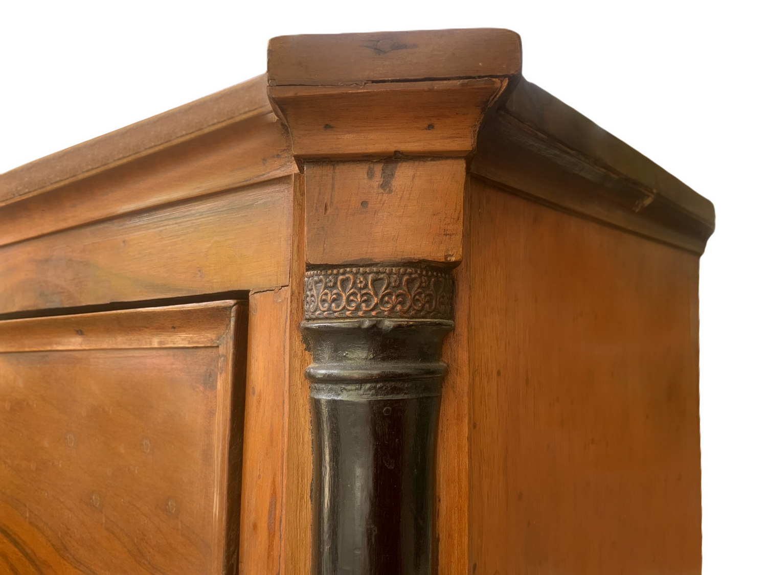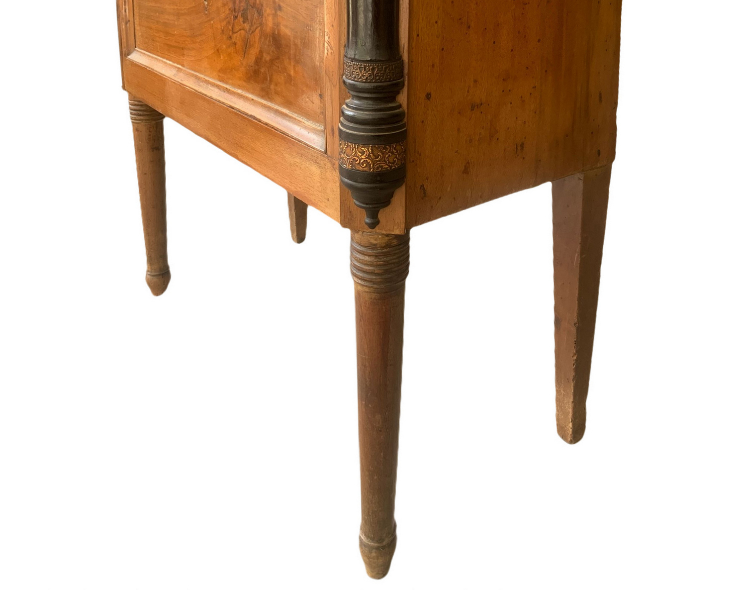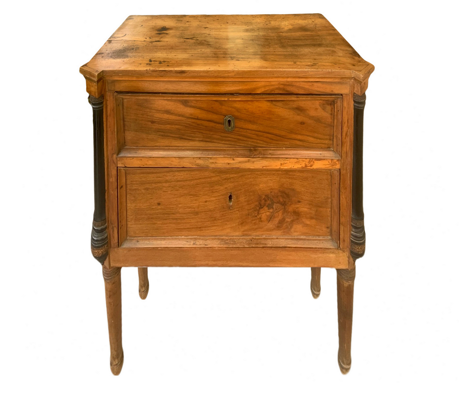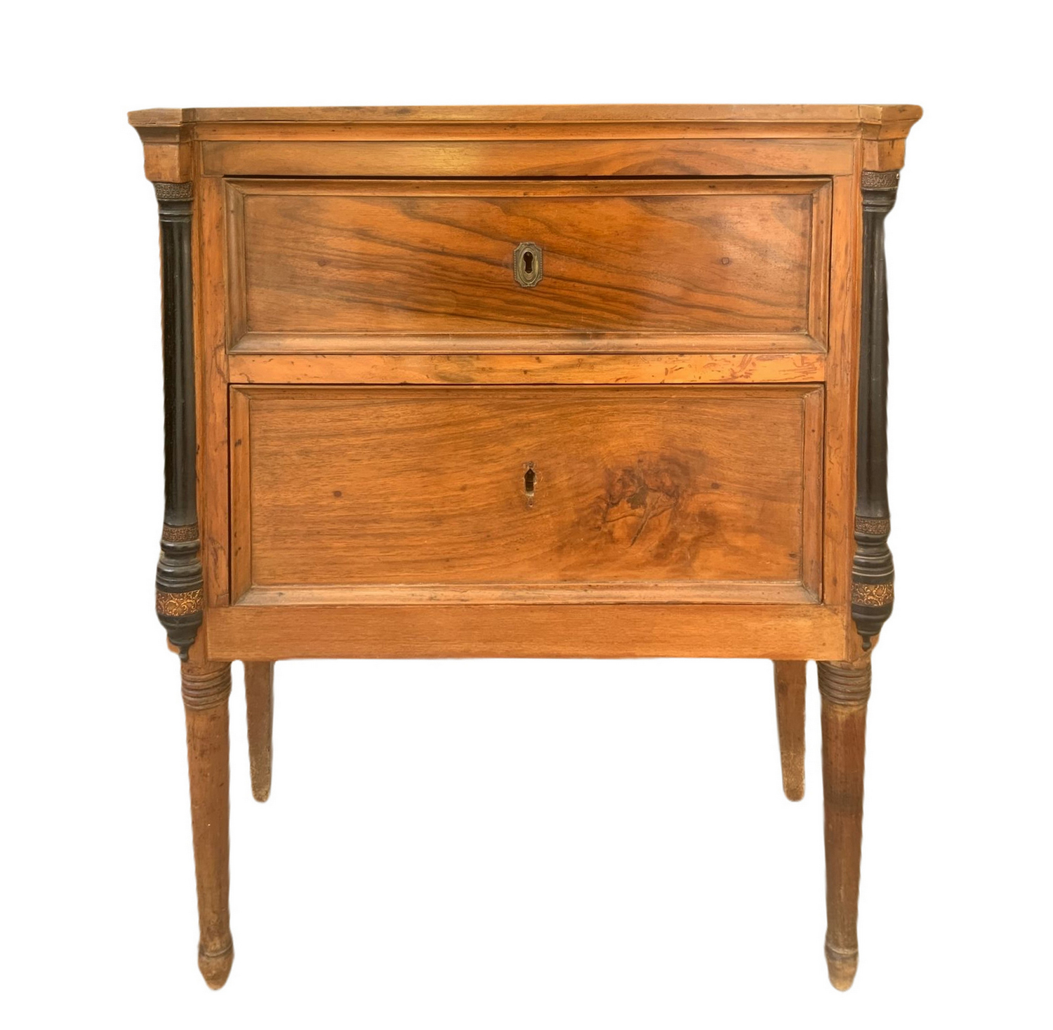 Comodino in legno di noce a due cassetti con colonne ebanizzate nero ai lati. Fine XVIII,Epoca Direttorio, Sicilia, fine XVIII secolo. H cm 79x64x30