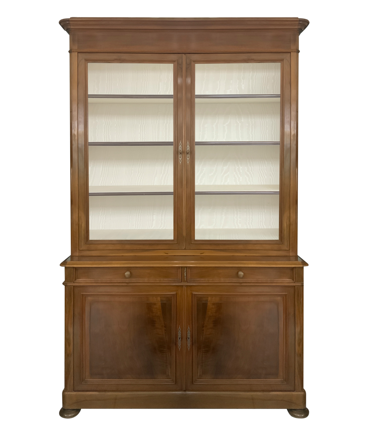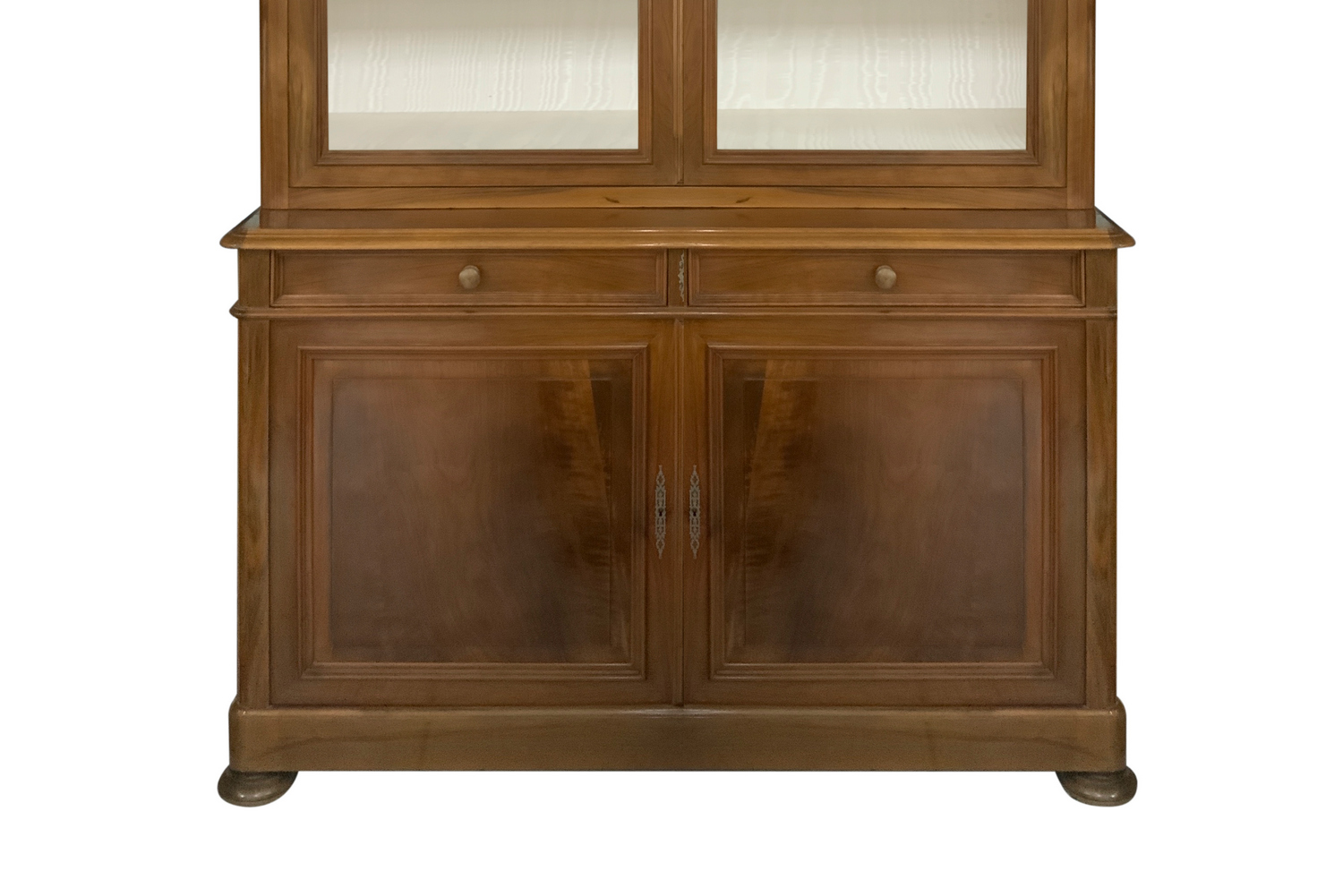 Credenza a due corpi. Provenienza Italia,in legno di noce nazionale chiara, corpo superiore a due ante in vetro, base con due sportelli, provenienza Italia. H cm 250, lunghezza cm 155, profondità cm 60 H cm 250, lunghezza cm 155, profondità cm 60