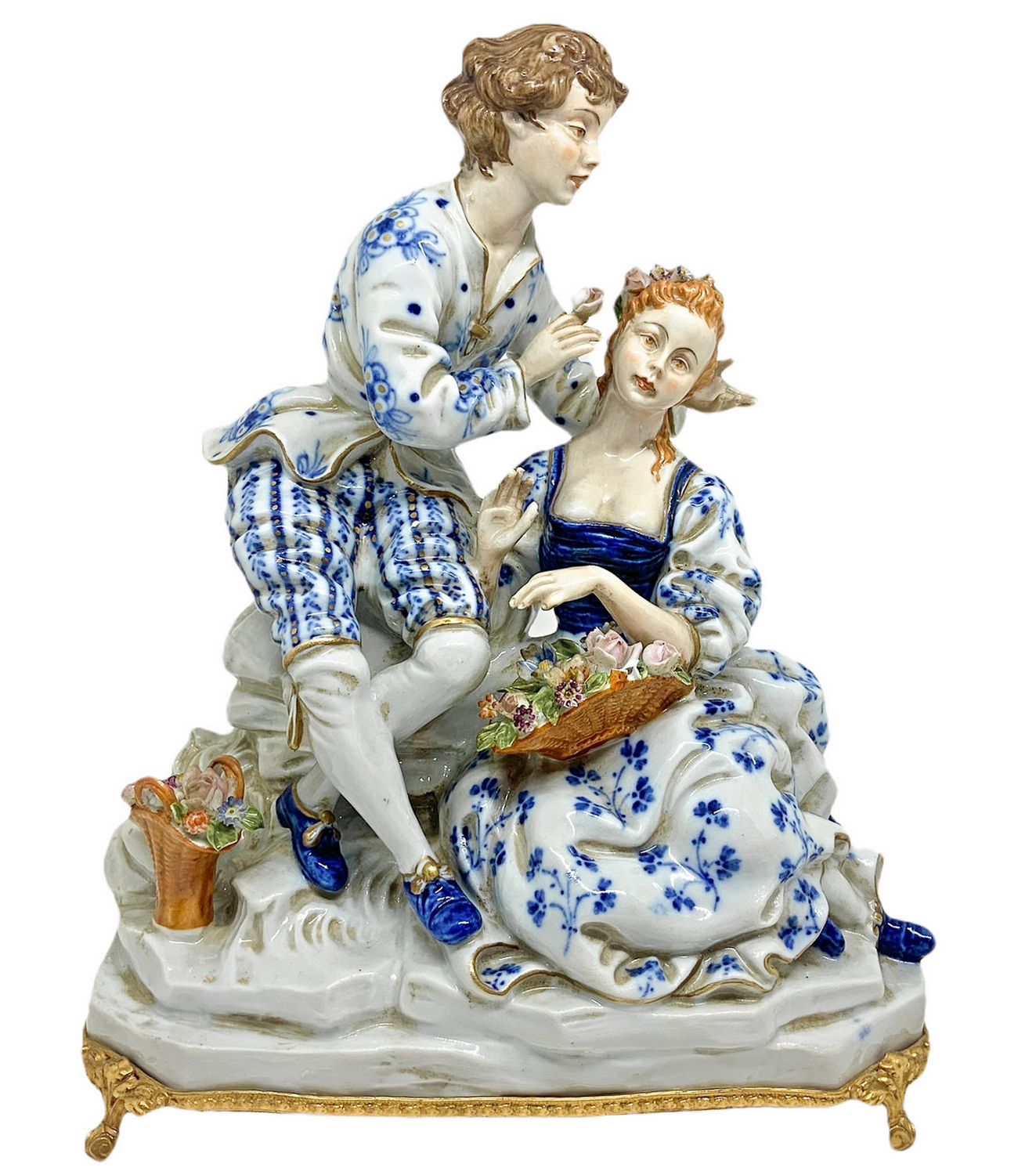 Capodimonte, Statuetta in porcellana raffigurante coppia galante con cesto. XX secolo. XX secolo,H cm 24x20x13